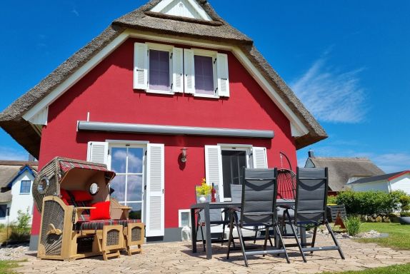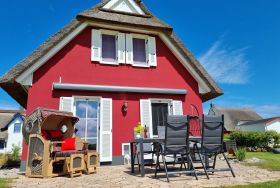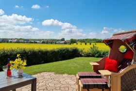 Auf der möblierten Terrasse haben Sie den ganzen Tag Sonne und Sie können den Blick über die Felder bis hin zum Erholungsort Zierow schweifen lassen. Eine gemütliche Sitzlounge lädt zum Entspannen und Bücher lesen ein. Die Terrasse ist mit einer elektrischen Markise versehen. Im Garten ist ein Grill und ein Gartenhaus zum Unterstellen Ihrer mitgebrachten Fahrräder. Im Reethaus erwartet Sie eine komfortable, hochwertige Ausstattung. Im gesamten Haus ist eine Fußbodenheizung und Fliesen verlegt. Im Erdgeschoss befindet sich das Wohnzimmer mit Kamin. Machen Sie es sich auf der großen Wohnlandschaft gemütlich - Spiele, Bücher, DVD`s, Sat-TV mit DVD sorgen für Unterhaltung. W-LAN ist kostenfrei nutzbar. Eine Waschmaschine steht im Hauswirtschaftsraum bereit. Die Küche ist separat und lädt zum Kochen ein. Der Essbereich ist hier integriert. Die Küche ist mit Geschirrspüler, Ceran-Kochfeld, Backofen, Toaster, Kaffeemaschine, Radio, Kühlschrank mit Gefrierfach und vielen Kochutensilien ausgestattet.