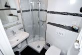 Das Badezimmer ist praktisch eingerichtet und verfügt über eine Dusche, ein WC, ein Waschbecken, einen Handtuchwärmer sowie einen Föhn – ideal, um sich nach einem Strandtag oder nach Aktivitäten im Ferienpark schnell zu erfrischen.