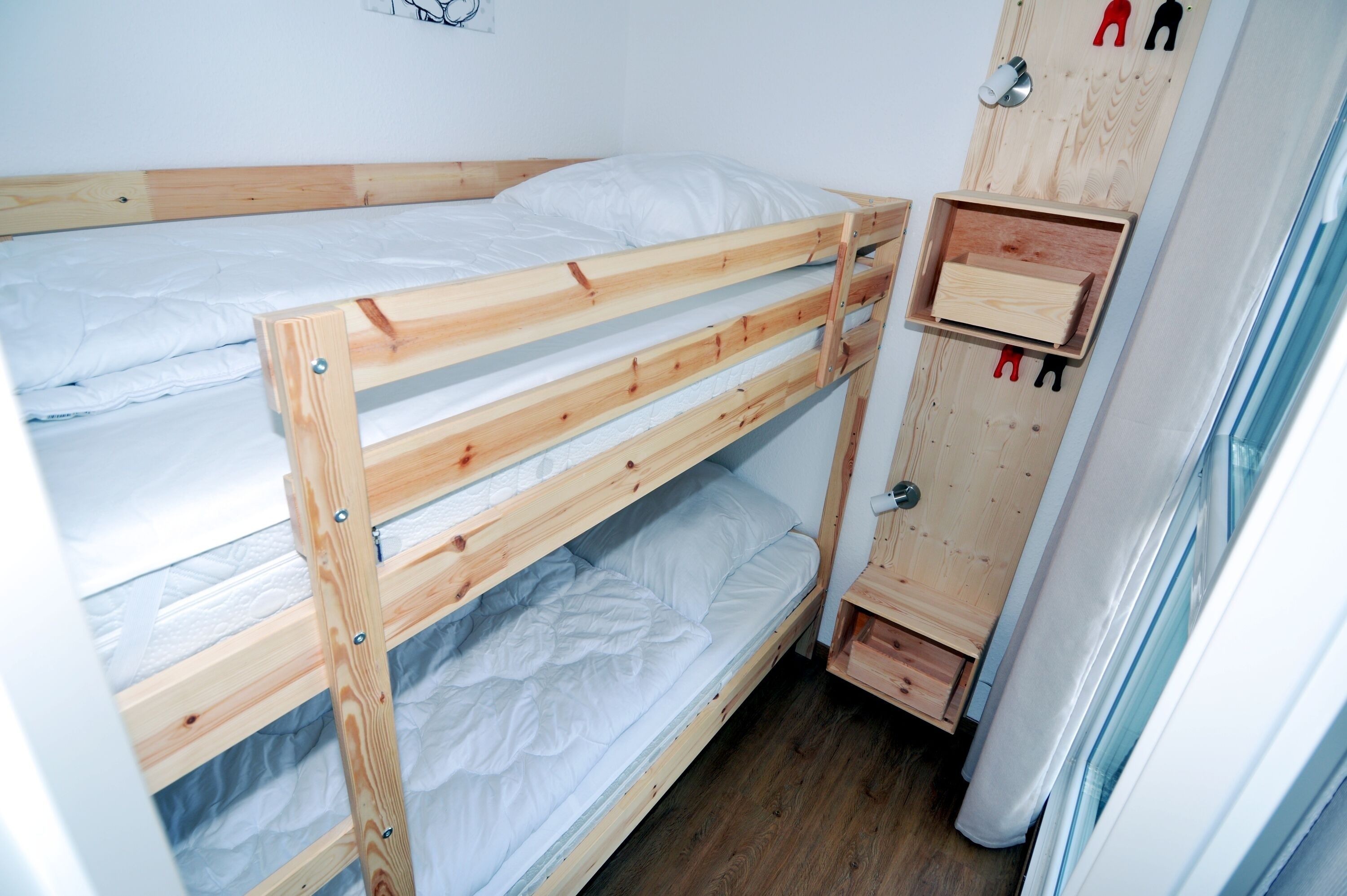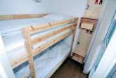 Der kombinierte Wohn- und Schlafbereich ist hell und funktional eingerichtet und bietet eine angenehme Urlaubsatmosphäre. Ein komfortables Doppelbett (160x200) sorgt für erholsame Nächte. Für die kleinen Urlaubsgäste steht ein Etagenbett zur Verfügung, das einen eigenen Schlafbereich schafft. Verdunklungsmöglichkeiten ermöglichen auch tagsüber Ruhe und Privatsphäre.