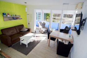 Herzstück der Wohnung ist der Wohn- und Essbereich, der freundlich und einladend gestaltet ist. Hier können Sie gemeinsam entspannen, den Tag Revue passieren lassen oder gemütliche Abende verbringen. Ein Fernseher sowie WLAN / WiFi stehen für Unterhaltung und digitale Annehmlichkeiten zur Verfügung.