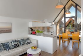 Über eine innenliegende Treppe gelangen Sie ins Dachgeschoss, wo sich der großzügige Wohnbereich mit angrenzender offener Küche befindet. Die voll ausgestattete Küche verfügt über einen Geschirrspüler, einen modernen Ceranherd und zahlreiche weitere Annehmlichkeiten, sodass Sie sich auch im Urlaub bequem selbst versorgen können. Direkt angeschlossen ist der gemütliche Essbereich, der mit seinem maritimen Stil perfekt in das Gesamtkonzept der Wohnung passt.
