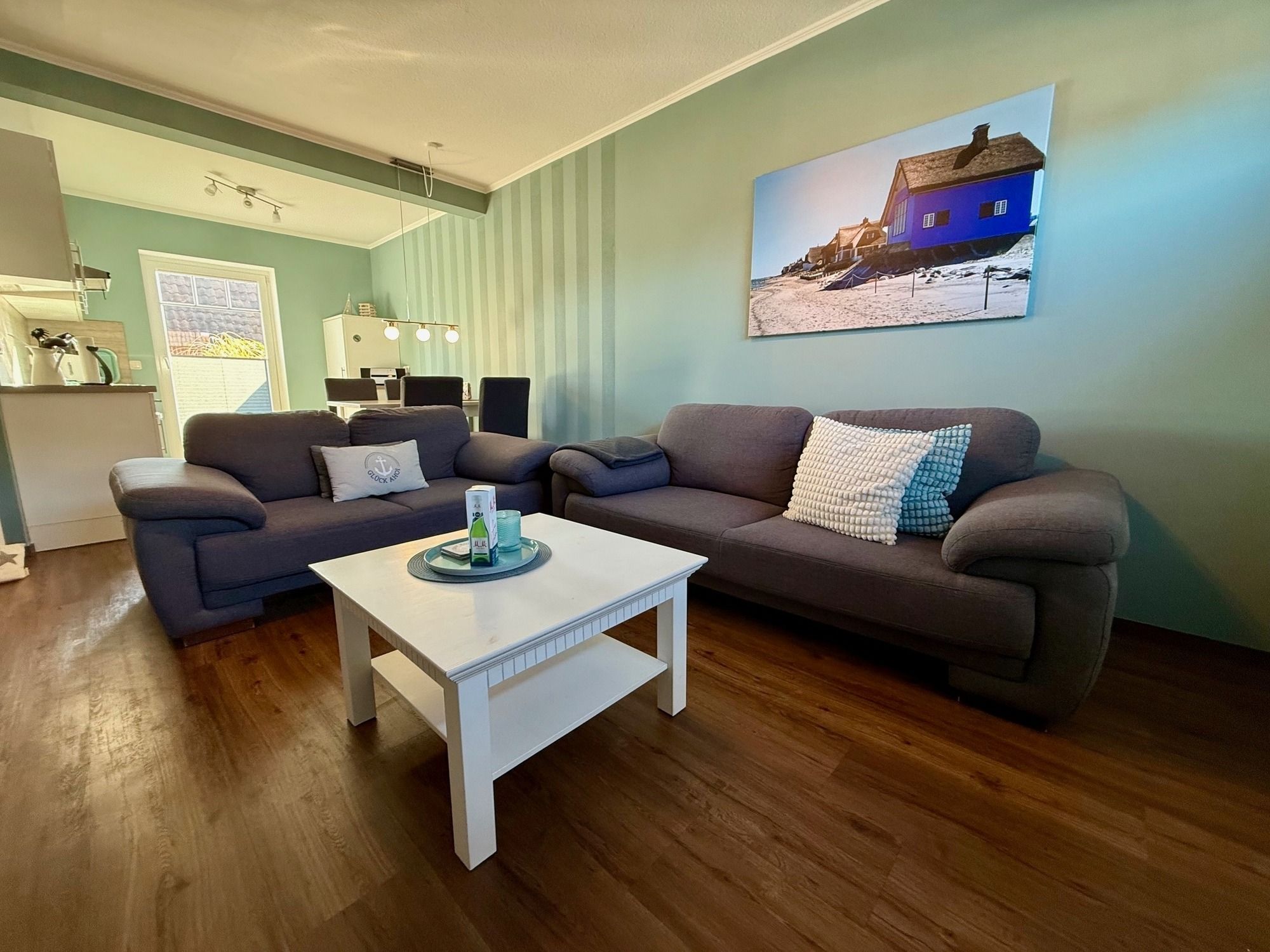 Herzstück des Ferienhauses ist der freundlich gestaltete Wohnbereich, der ausreichend Platz für gemeinsame Stunden bietet. Hier können Sie entspannen, den Tag Revue passieren lassen oder gemütliche Abende vor dem Fernseher verbringen. Die angrenzende Küchenzeile ist funktional ausgestattet und bietet alles, was Sie für die Selbstversorgung während Ihres Aufenthaltes benötigen. Ein Geschirrspüler sorgt für zusätzlichen Komfort, während die Kaffeemaschine den perfekten Start in den Urlaubstag ermöglicht.
