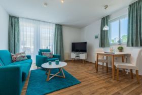 Die Ferienwohnung verfügt über einen Wohnbereich mit Schlafcouch, eine separate Küche, ein Schlafzimmer, ein Bad mit Dusche und einen Balkon.
