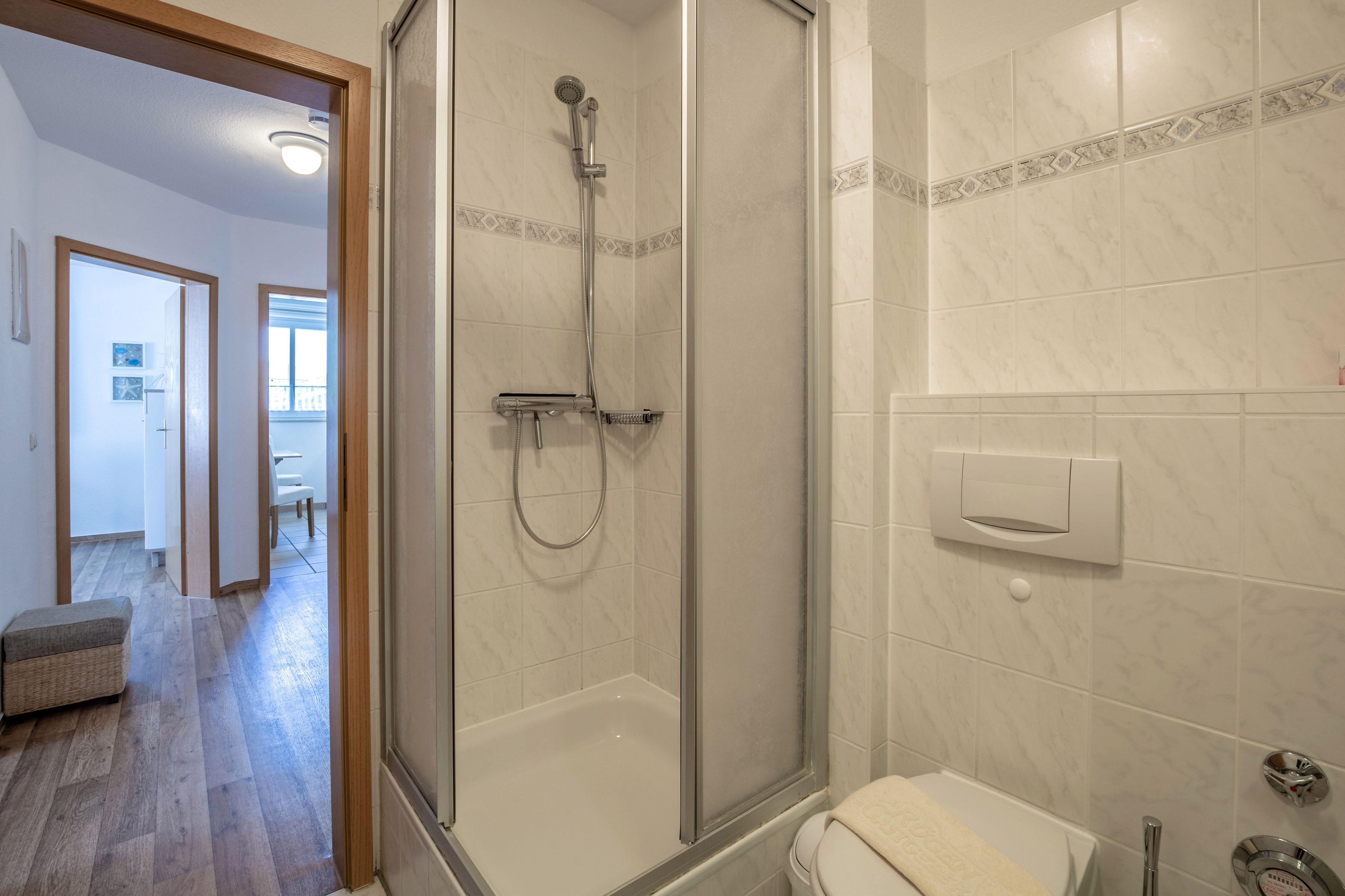 Das Badezimmer ist mit einer Dusche und WC ausgestattet.