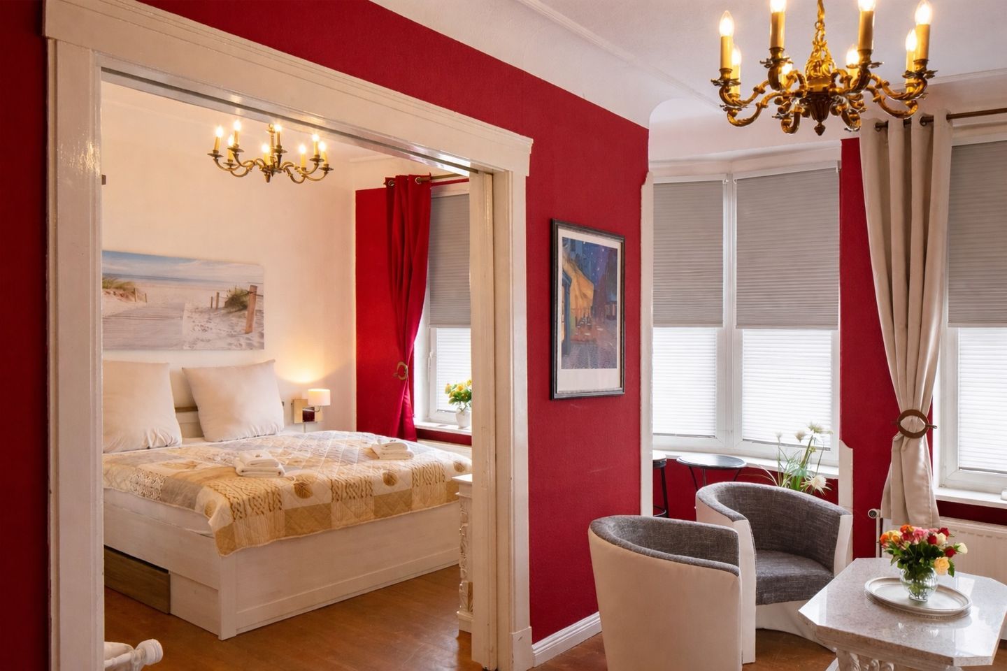 Die „Royal Suite“ erstreckt sich über das zweite Obergeschoss eines denkmalgeschützten Hauses aus dem Jahr 1887. Bewusst im Vintage-Stil gestaltet, ist die Wohnung mit einer gelungenen Mischung aus antiken Möbelstücken und Accessoires ausgestattet. Der Wohnbereich ist mit gemütlichen Dielen ausgestattet und lädt mit einer Sofaecke und einem Esstisch zum Verweilen ein. Die große Fensterfront sorgt für eine helle und freundliche Atmosphäre und bietet den Blick auf die malerische Altstadt.