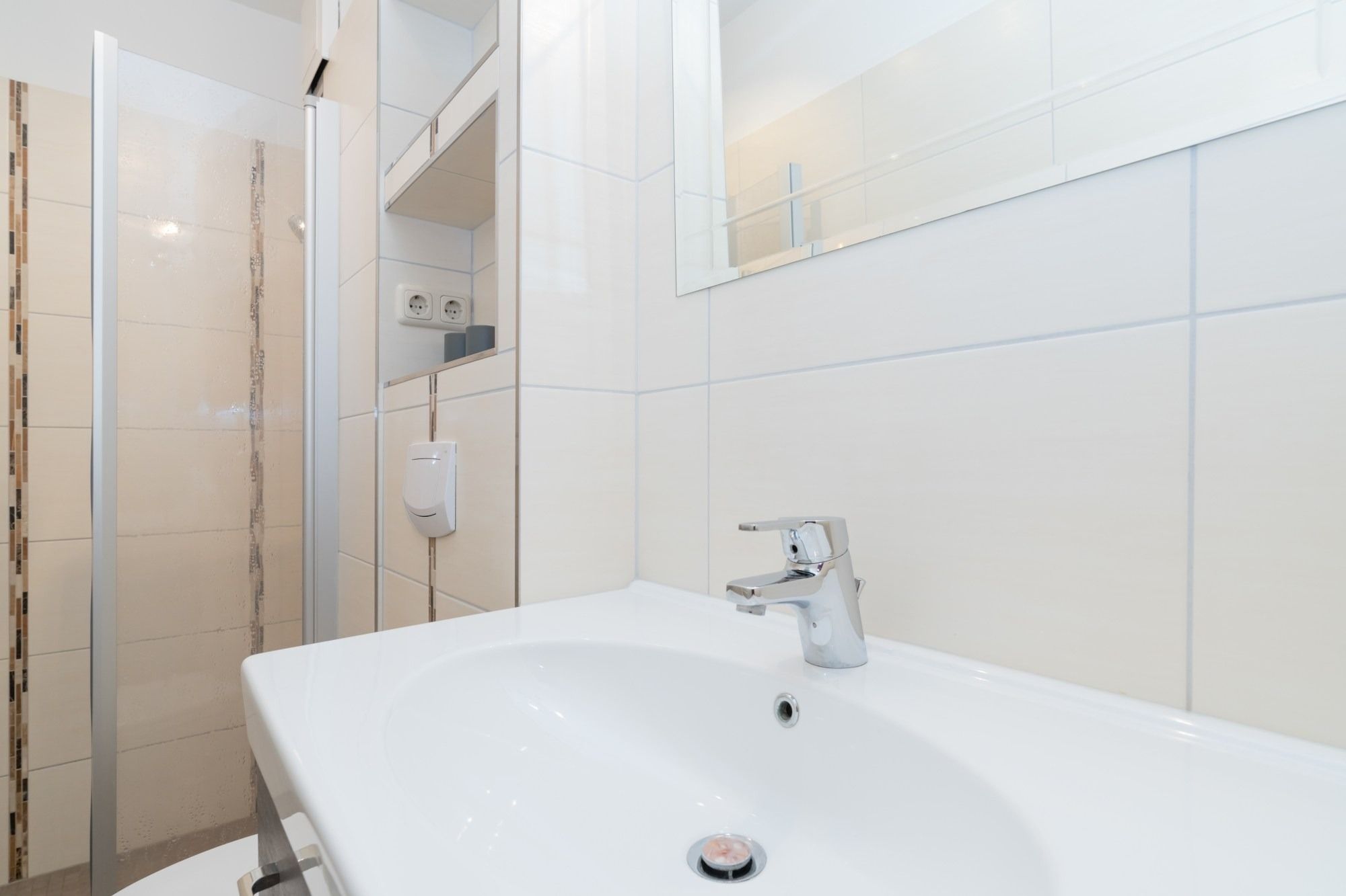 Die hier angrenzende Küchenzeile ist mit einem Kühlschrank mit Gefrierfach, einem Geschirrspüler und einem Backofen mit Kochfeld ausgestattet. Eine Kaffeemaschine, ein Toaster und ein Wasserkocher stehen Ihnen hier selbstverständlich zur Verfügung.