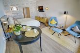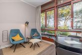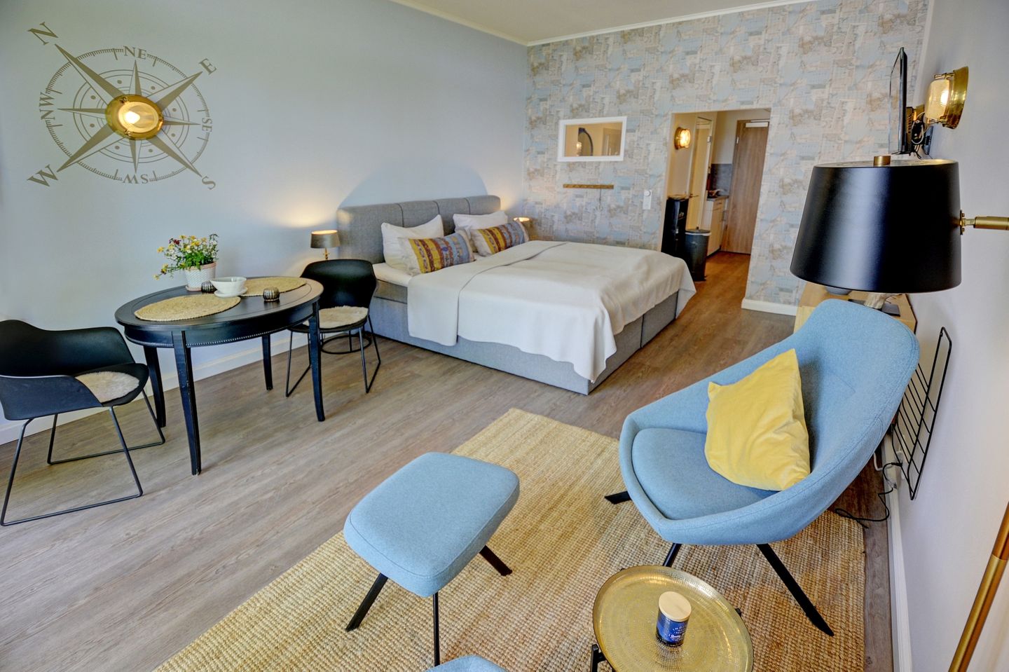 Das helle Apartment ist modern und mit Liebe zum Detail eingerichtet. Eine kleine, gut ausgestattete Kochnische ermöglicht es Ihnen, sich bequem selbst zu versorgen. Am Esstisch mit Meerblick lassen sich gemeinsame Mahlzeiten in entspannter Atmosphäre genießen. Dank der bodentiefen Fenster fällt viel Tageslicht in die Wohnung, was für ein angenehmes Wohngefühl sorgt – und mit etwas Glück hören Sie sogar das sanfte Rauschen der Wellen.