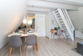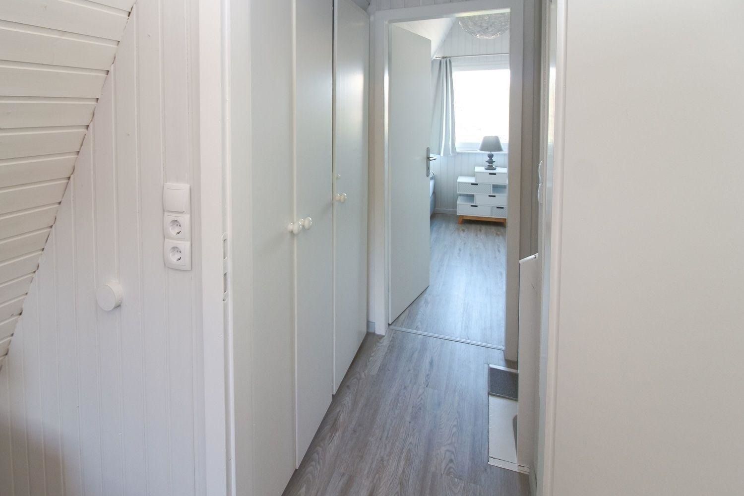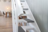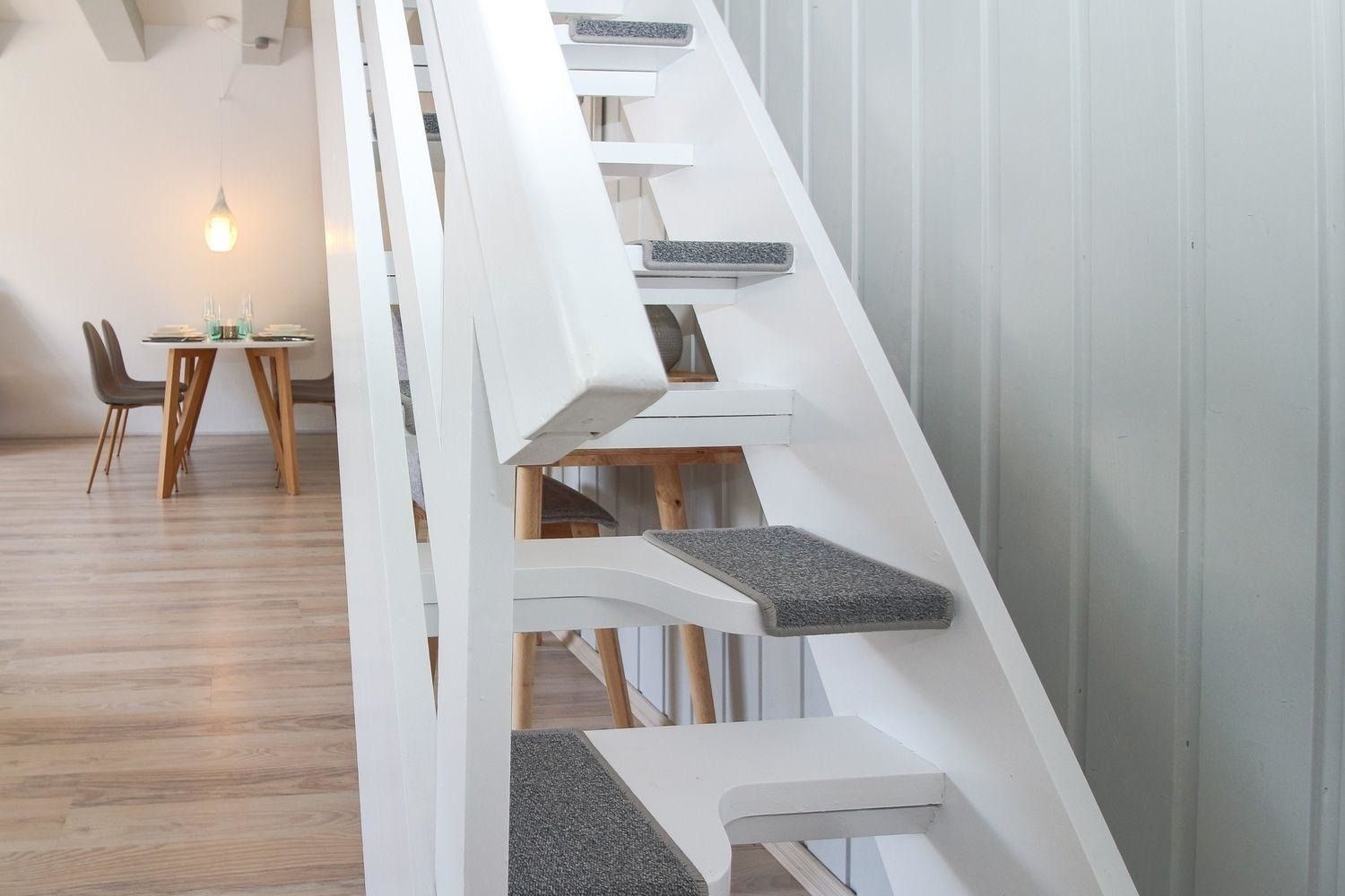 Bitte beachten Sie, dass es sich um eine steile Treppe zum Obergeschoss mit versetzten Stufen handelt.