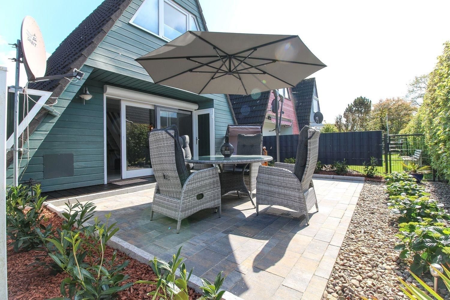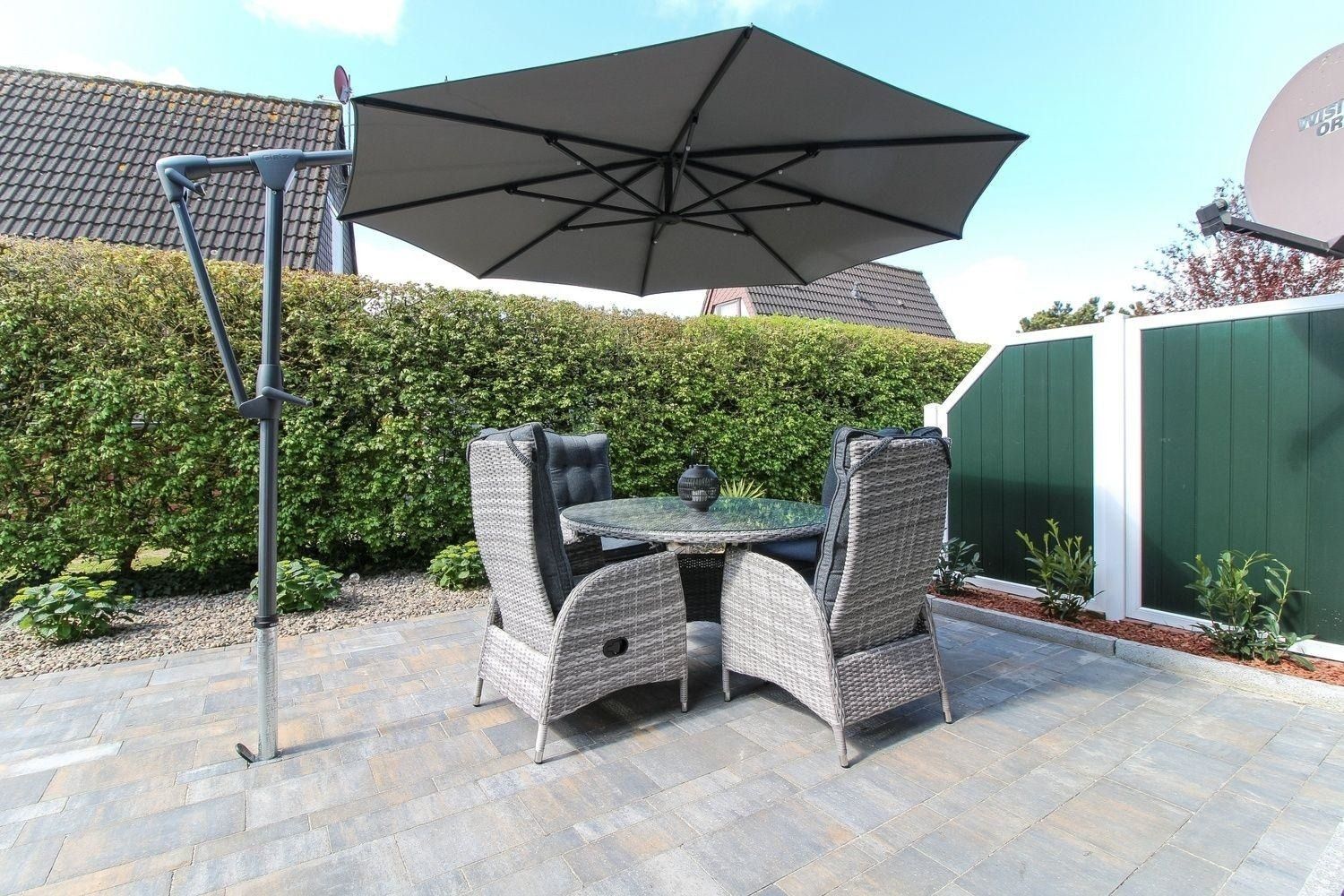 Die windgeschützte Sonnenterrasse liegt hinter dem Haus und ist von der Straße aus nicht einsehbar.