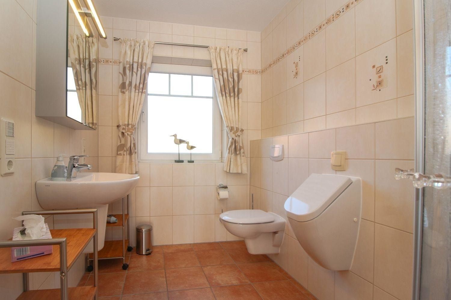 Im Erdgeschoss befindet sich ein Schlafzimmer mit Doppelbett, Kleiderschrank und Kommode und angrenzendem Duschbad mit Handtuchheizkörper, WC und Urinal. Im Obergeschoss mit offener Galerie finden Sie ein weiteres Schlafzimmer mit zwei Einzelbetten sowie einem zweiten Duschbad mit WC. Ideal für Urlaub mit der Familie oder mit guten Freunden.
