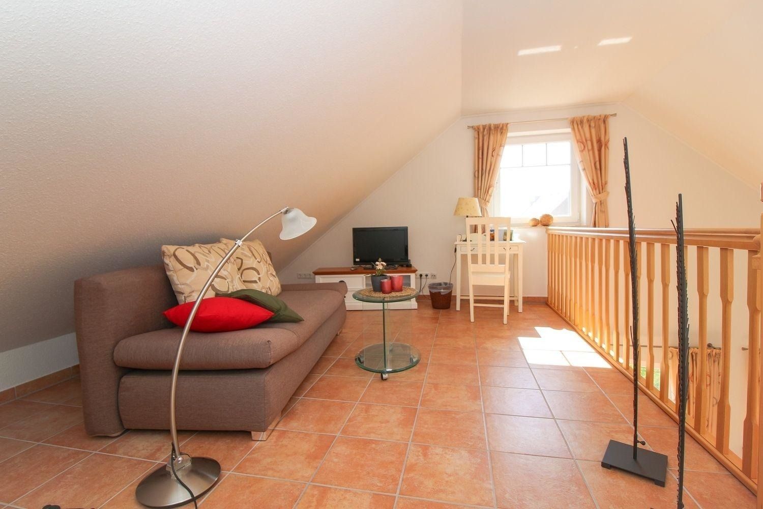 Ziehen Sie sich auf die offene Galerie mit gemütlicher Sitzgelegenheit zurück und lassen Sie Ihre Seele baumeln. Ein zweites SAT-TV steht hier für Sie bereit, oder stöbern Sie in den Ostfriesland-Heften und den bereitliegenden Büchern.