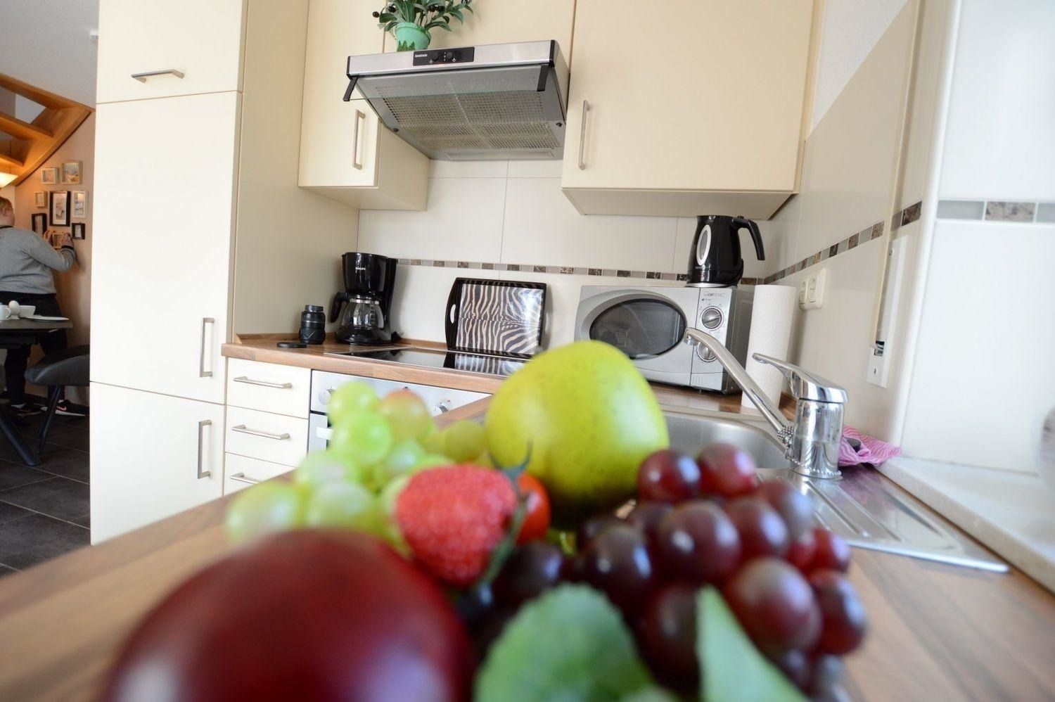 In dieser schicken OG-Wohnung werden Sie sich wohlfühlen. Der in warmen Naturtönen gehaltene Wohnbereich beherbergt neben gemütlichen Möbeln ein Flachbildschirm-TV, einen DVD Player und eine Stereoanlage. Die offene Küche mit Backofen, Mikrowelle und Ceranfeld schließt mit dem Essbereich ab.