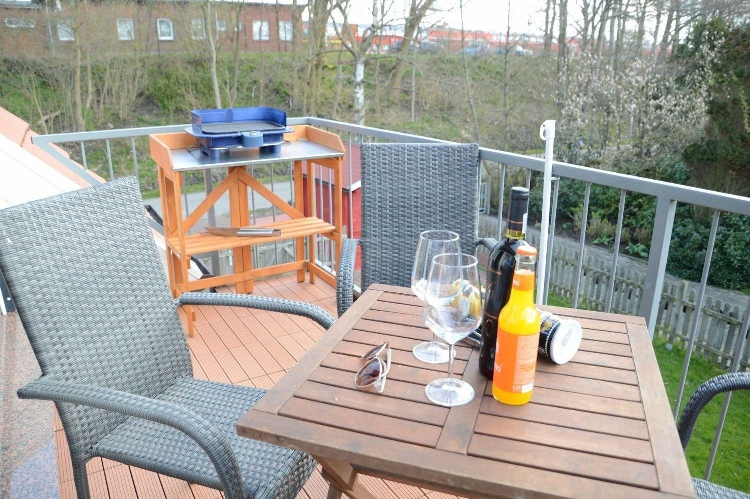 Der Balkon ist mit Gartenmöbeln und Grill ausgestattet.