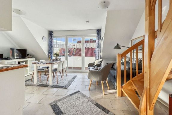 Auf 62 m² bietet die Obergeschosswohnung alles, was Sie für einen komfortablen Aufenthalt benötigen: eine offene Wohnküche im maritimen Stil, ein modernes Tageslicht-Badezimmer mit ebenerdiger Dusche und WC, ein Elternschlafzimmer auf der gleichen Etage mit Doppelbett (1,80 x 2,00 m) und TV sowie einen praktischen Abstellraum.