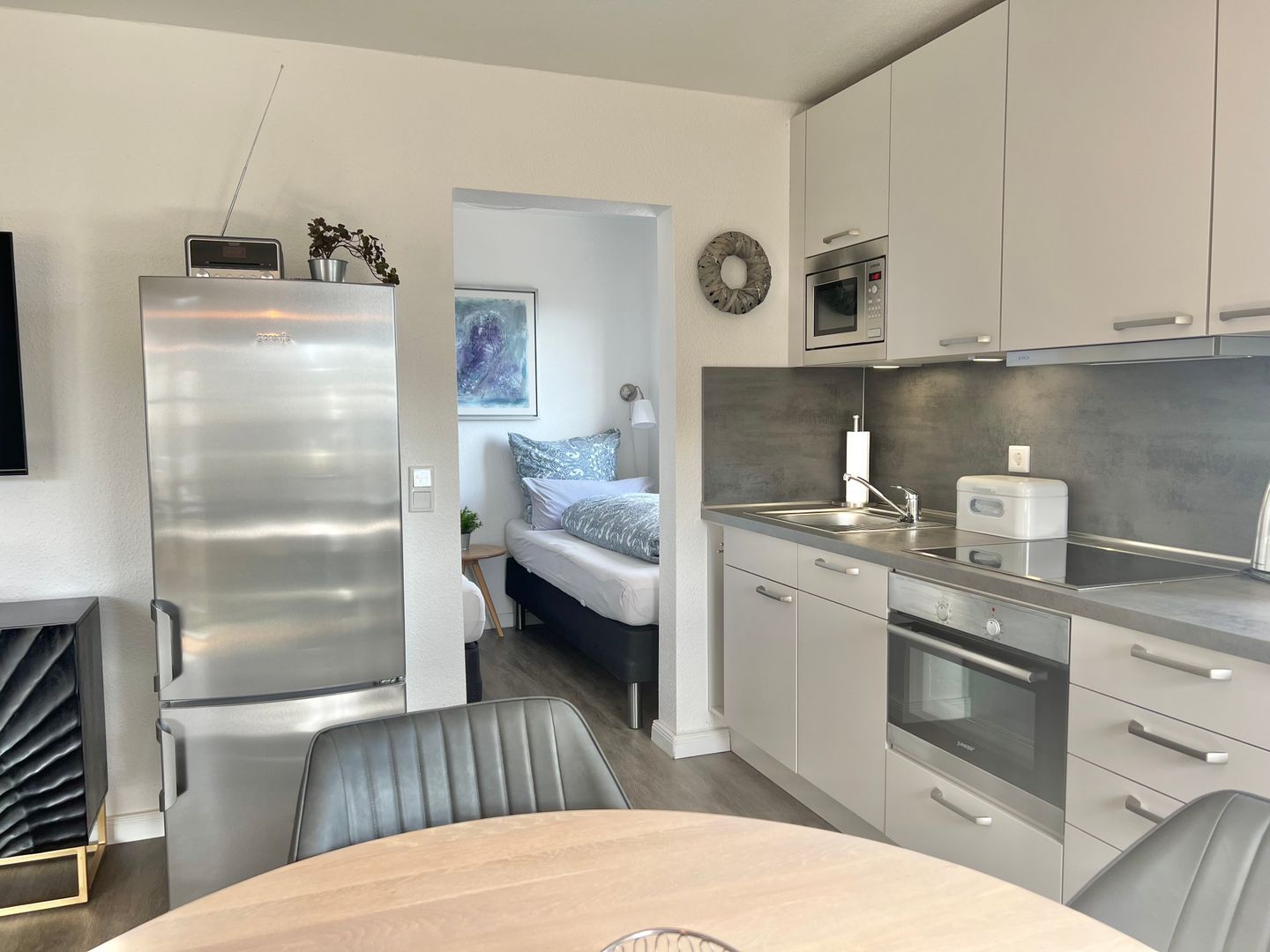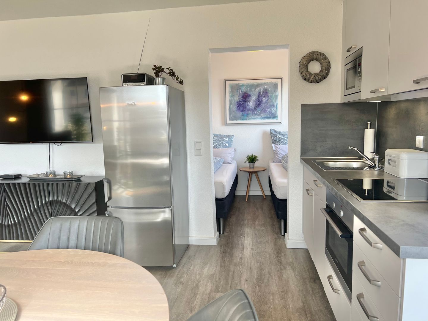 Das lichtdurchflutete Studio verfügt über ein gemütliches Doppelbett. Die voll ausgestattete Einbauküche bietet alles, was Sie für eine bequeme Selbstversorgung benötigen. Das moderne Duschbad rundet das komfortable Angebot ab. Ein besonderes Highlight ist das zweiflügelige Dachfenster, das sich zu einem Dachaustritt öffnen lässt und Ihnen einen einzigartigen Blick auf die Förde und den Strand bietet.