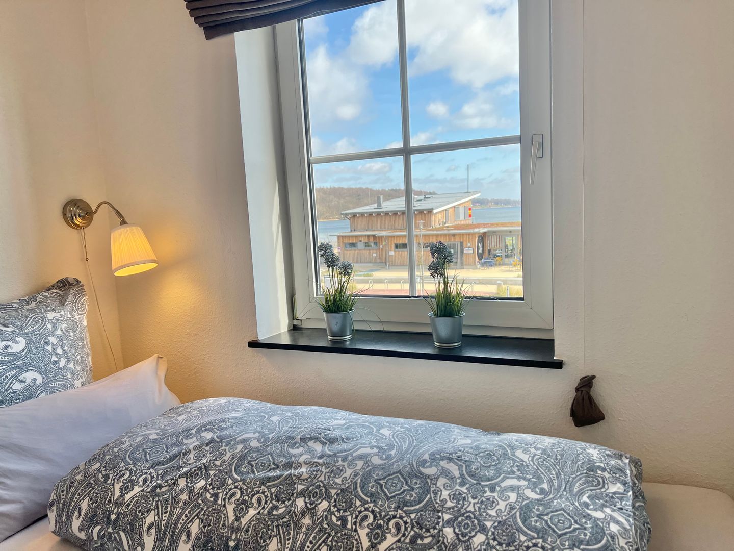 Der angrenzende Schlafraum verfügt über 2 Einzelbetten, die bei Bedarf auch zusammengeschoben werden können, und ein modernes Duschbad steht Ihnen zur Verfügung. Im Wohnraum erwartet Sie ein hochwertiges Ausziehsofa, das als bequemes Gästebett genutzt werden kann. Alle Fenster können zur Nacht verdunkelt werden und bieten dabei einen bezaubernden Blick auf die Flensburger Förde und die malerische Küstenlandschaft.