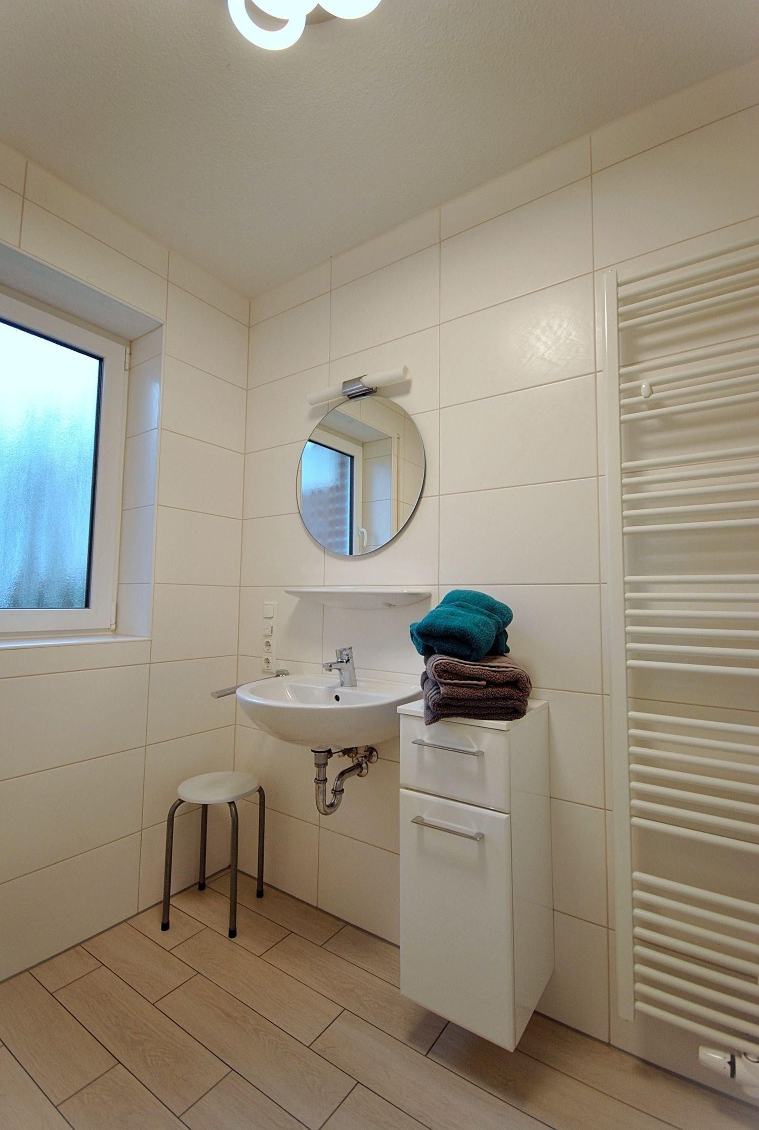 Tageslichtbad mit WC, ein Urinal, eine ebenerdige Dusche mit Echtglastüren sowie ein Handtuchheizkörper und Föhn.