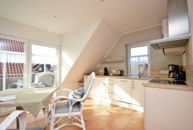 Erholung finden Sie in der hell gestalteten Wohnung. Der Wohnbereich mit 4 bequemen Esszimmer-Sessel und großem Esstisch lädt seine Gäste zu Entspannung ein. Zur Unterhaltung trägt der vorhandene 40 Zoll Flachbild-TV mit Blue-Ray-Player sowie die Bücher und Spiele bei. Die helle und sehr gut ausgestattete Einbauküche enthält Herd mit Ceranfeld, Abzugshaube, Kühlschrank mit Gefrierfach, Geschirrspüler sowie Kaffeemaschine, Wasserkocher, Toaster, Eierkocher, Mikrowelle sowie ausreichende Koch- und Küchenutensilien.