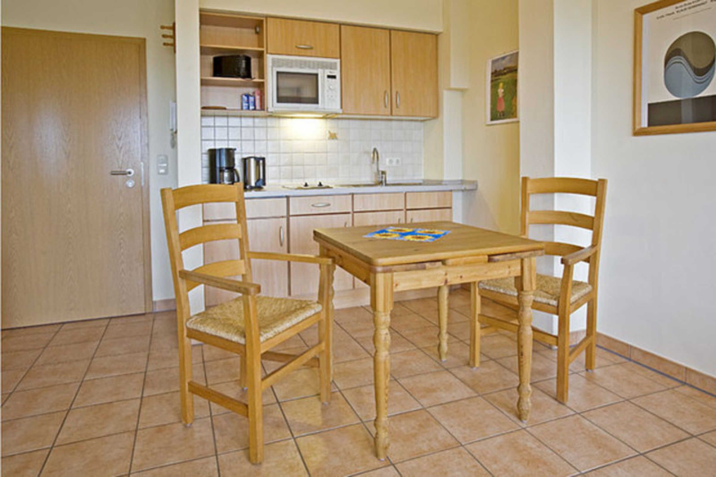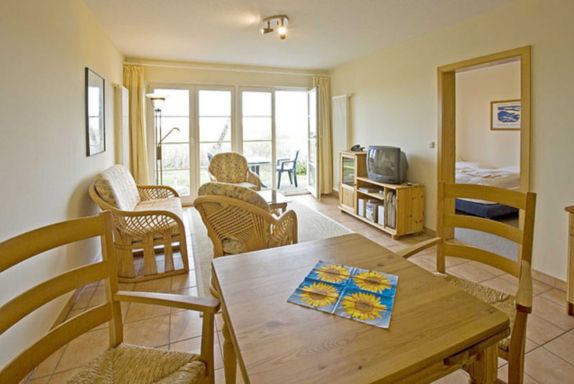 Die Wohnung Luise für 2 Personen im Erdgeschoß in der Mitte des Hauses ist mit einer großen West-Terrasse mit Tisch, Stühlen und Sonnenschirm ausgestattet. Eine große Fensterfront mit Terrassentür bestimmt das großzügige Wohnzimmer mit einer Küchenzeile und Esstisch. Daneben befinden sich das Schlafzimmer mit 2 Betten und das innenliegende Bad mit Badewanne.