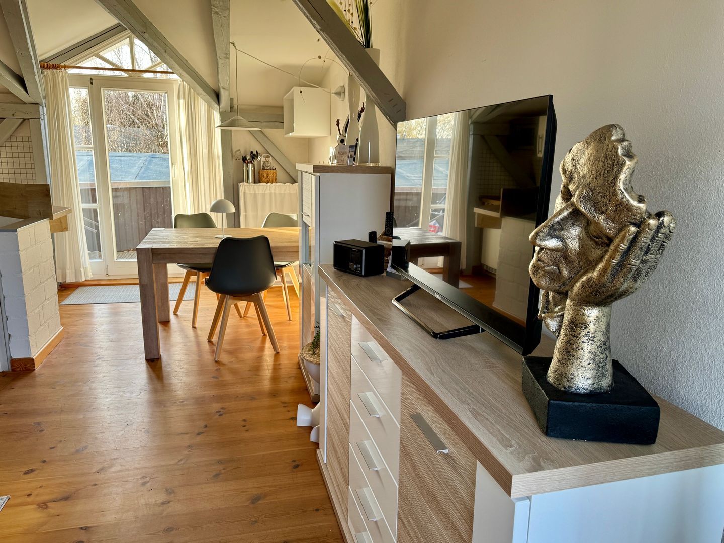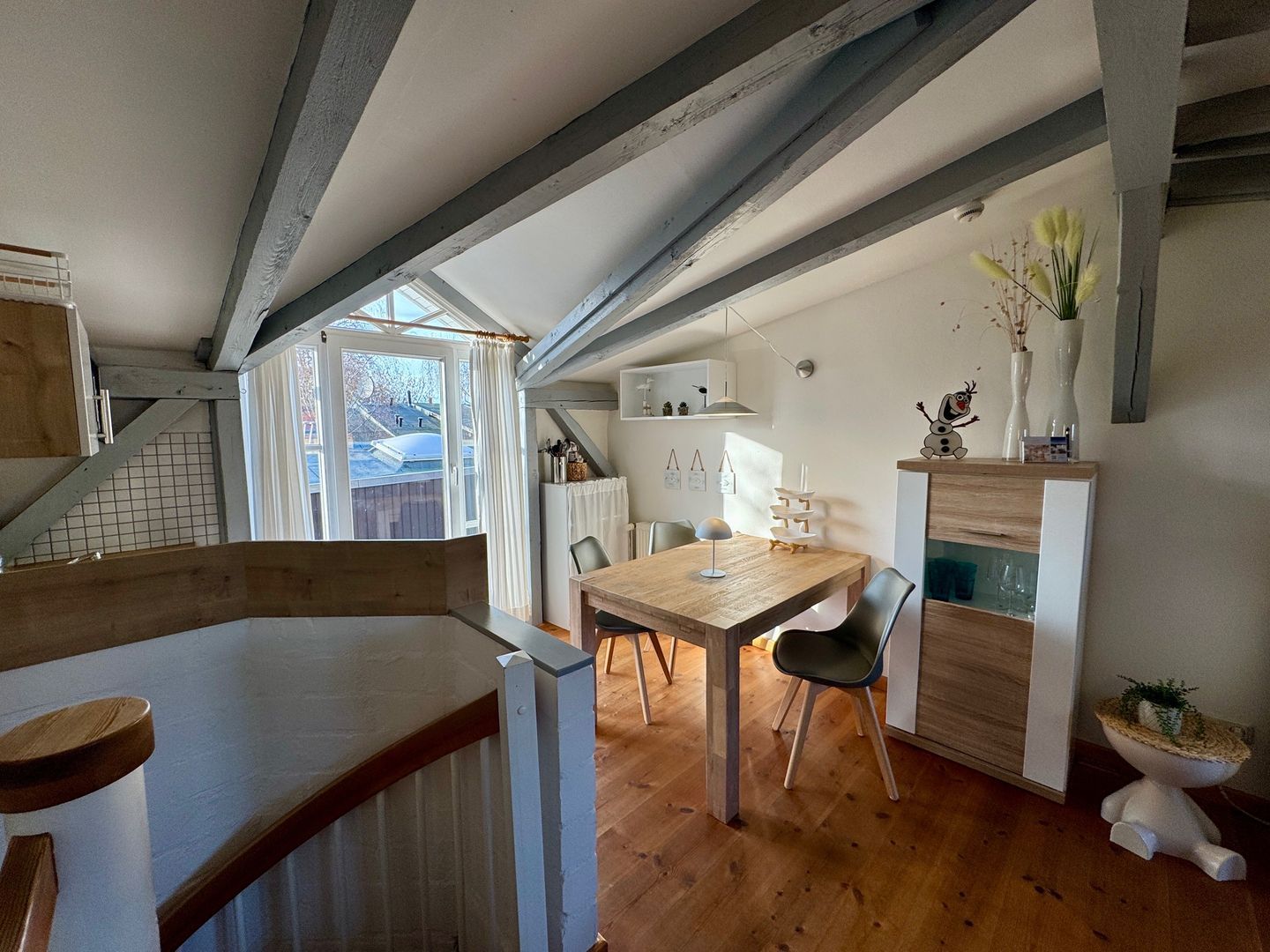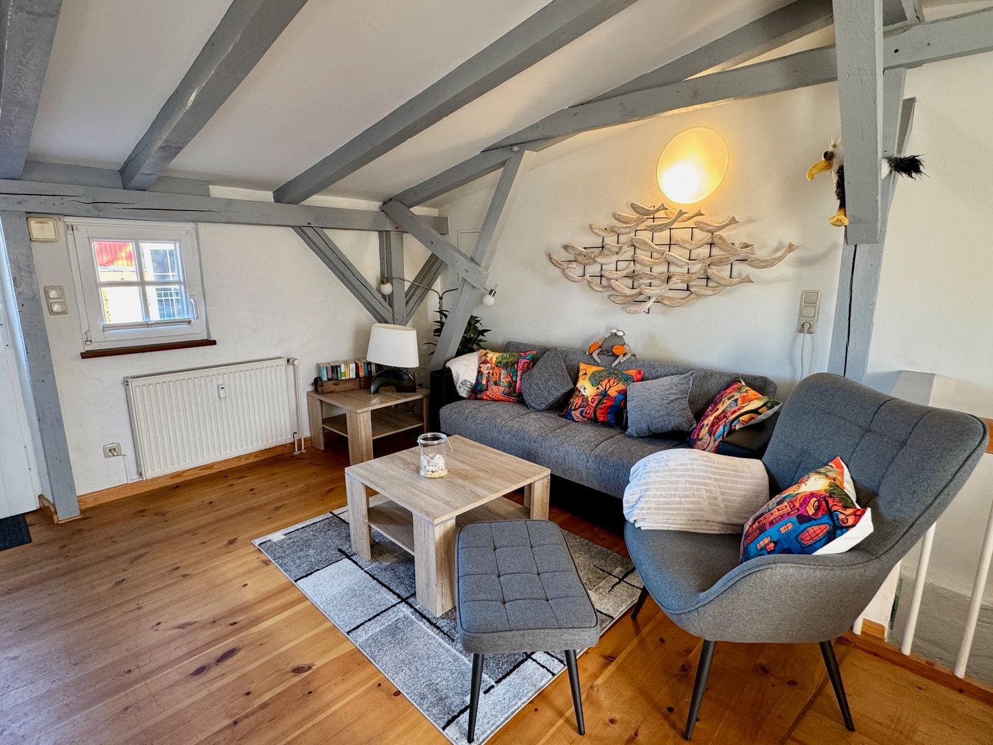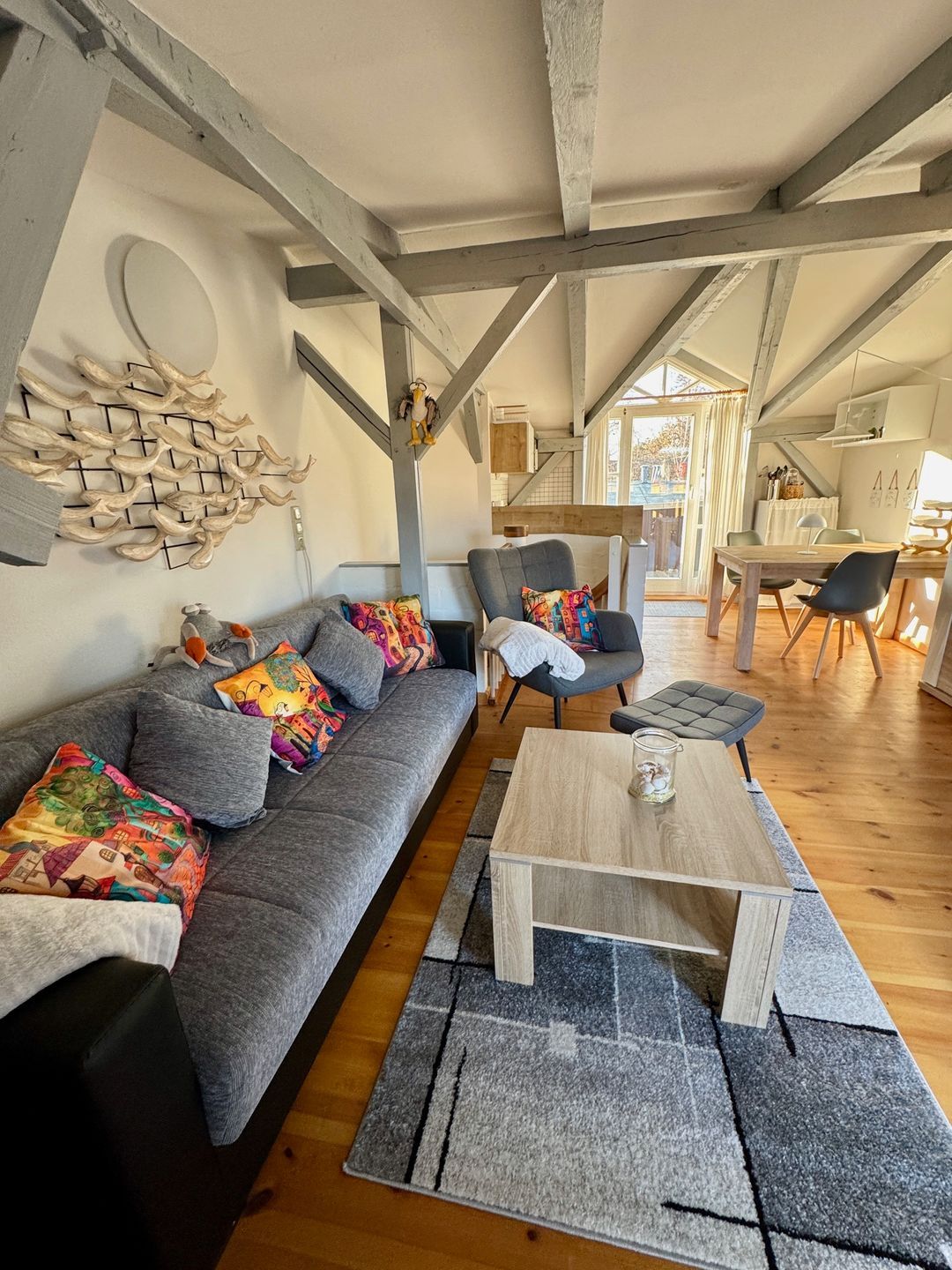 Die Wohnung selbst liegt im Obergeschoss und empfängt Sie mit einem offenen, hellen Wohn- und Küchenbereich. Sie bietet Platz für drei Personen und einen Hund. Die moderne Küche ist komplett ausgestattet mit 2 Platten Ceranfeld-Herd, Kühlschrank, Mikrowelle, Kaffeemaschine, Toaster und Wasserkocher – perfekt für ein gemeinsames Frühstück oder ein entspanntes Abendessen. Vom Wohnbereich aus gelangen Sie direkt auf den Balkon, der mit Gartenmöbeln zum Verweilen einlädt – ob mit einer Tasse Kaffee am Morgen oder einem Glas Wein am Abend.