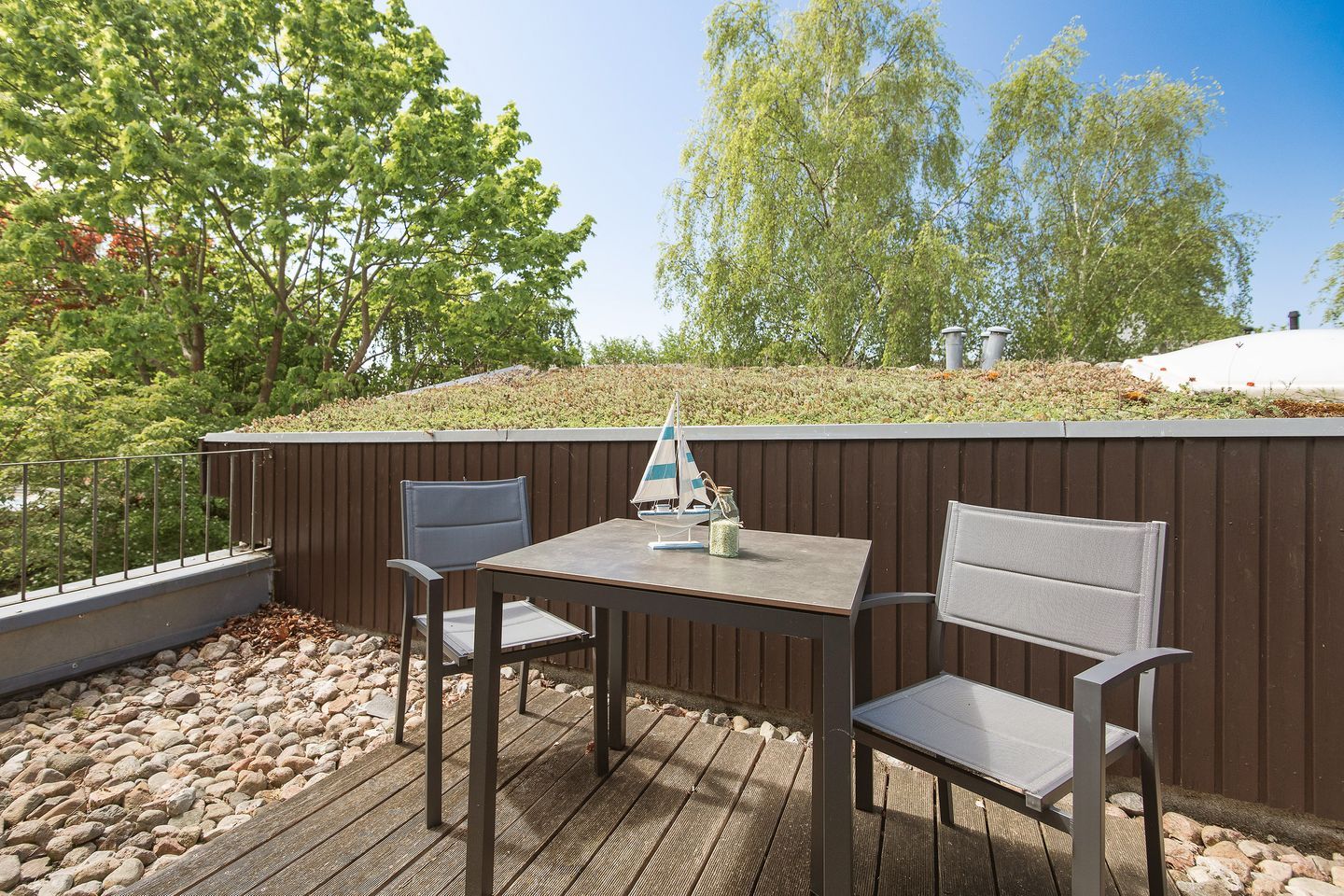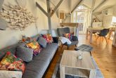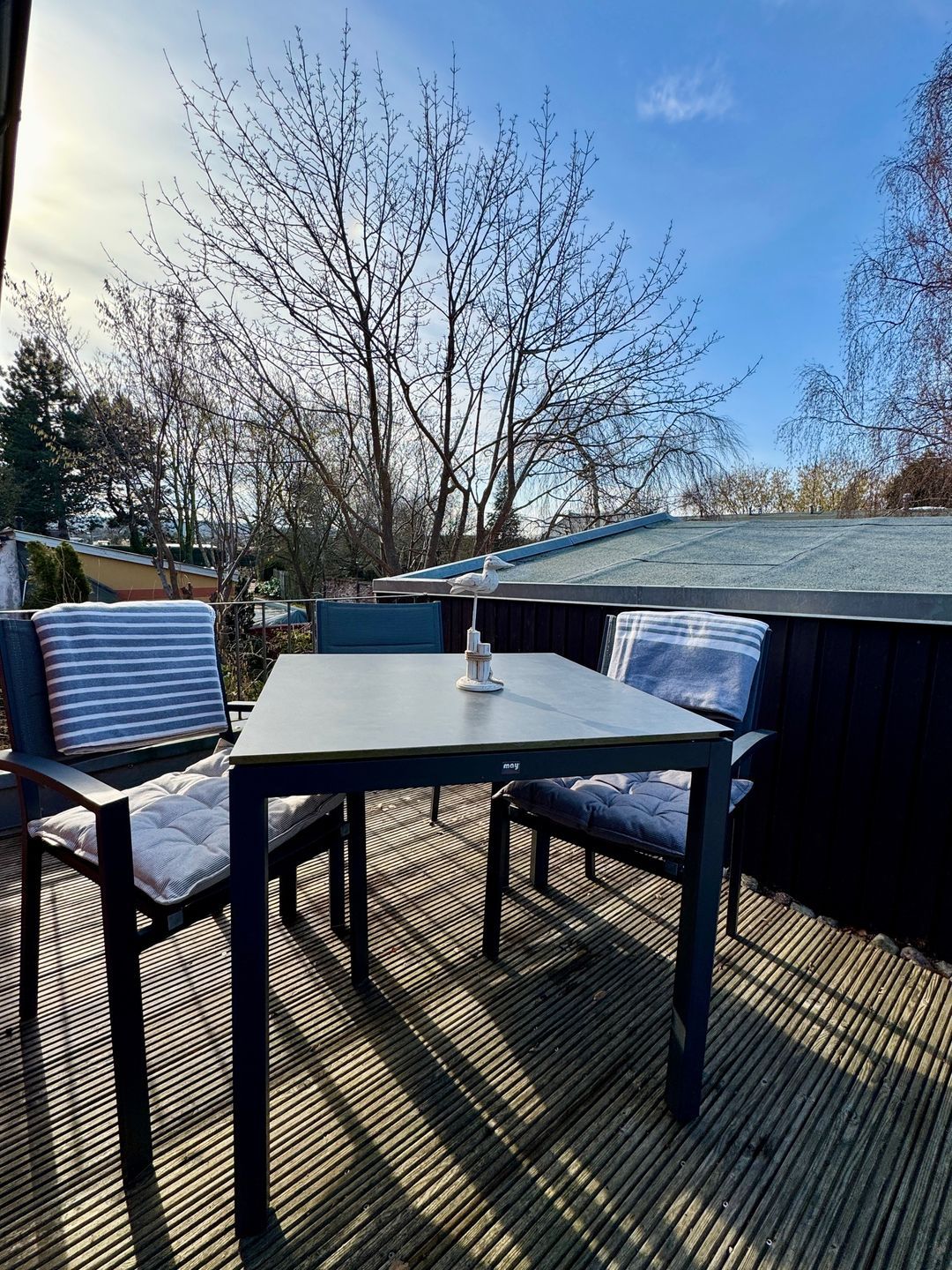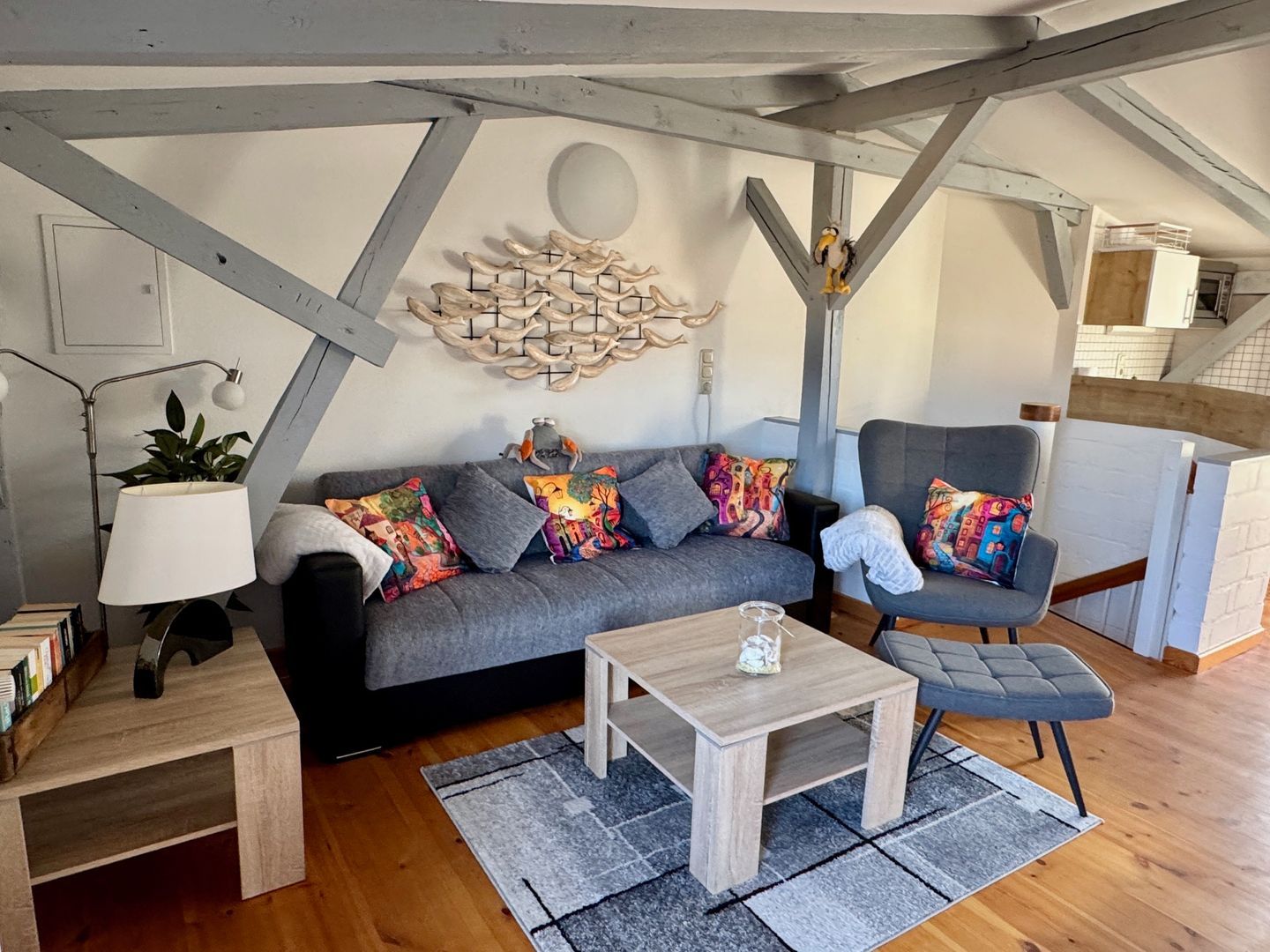 Die Wohnung selbst liegt im Obergeschoss und empfängt Sie mit einem offenen, hellen Wohn- und Küchenbereich. Sie bietet Platz für drei Personen und einen Hund. Die moderne Küche ist komplett ausgestattet mit 2 Platten Ceranfeld-Herd, Kühlschrank, Mikrowelle, Kaffeemaschine, Toaster und Wasserkocher – perfekt für ein gemeinsames Frühstück oder ein entspanntes Abendessen. Vom Wohnbereich aus gelangen Sie direkt auf den Balkon, der mit Gartenmöbeln zum Verweilen einlädt – ob mit einer Tasse Kaffee am Morgen oder einem Glas Wein am Abend.