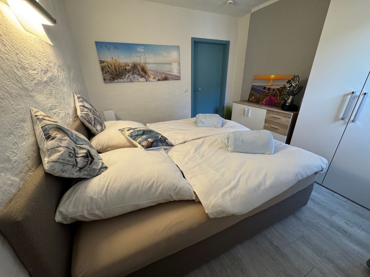 Eine elegante Spindeltreppe führt Sie ins Erdgeschoss, wo sich das geschmackvoll eingerichtete Schlafzimmer mit einem großen Boxspringbett, einem geräumigen Kleiderschrank und einer Kommode befindet. Direkt daneben liegt das moderne Bad mit Dusche – hier starten Sie erfrischt in den Tag. Ein eigener PKW-Stellplatz rundet das Angebot ab.