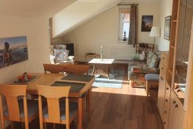 Die Ferienwohnung verfügt über zwei Zimmer: Ein separates Schlafzimmer mit bequemen Schlafmöglichkeiten und ein stilvoll eingerichtetes Wohnzimmer mit ausziehbarem Sofa. Insgesamt bieten vier Schlafplätze ausreichend Komfort. Für angenehme Nächte sorgen neben der Bettwäsche auch ein Sichtschutz für alle Fenster und die Zentralheizung.
