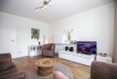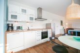 Herzstück der Wohnung ist der offene Wohn-Essbereich: Hier lädt die voll ausgestattete Küche zum gemeinsamen Kochen ein, während am Esstisch Platz für gesellige Mahlzeiten ist. Die gemütliche Sofa-Ecke mit TV sorgt für entspannte Abende.