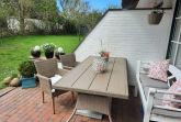 Vom Wohnbereich gelangen Sie direkt auf die nach Süden ausgerichtete Terrasse, auf der Sie am Tisch mit Sitzbank und Sesseln eine Tasse Kaffee genießen oder den Tag am Abend gemütlich ausklingen lassen können. Für die Sonnengenießer steht ein 3-Sitzer-Strandkorb zum relaxen zur Verfügung.