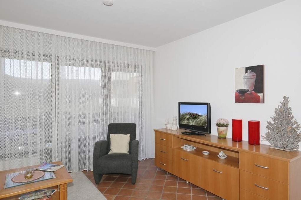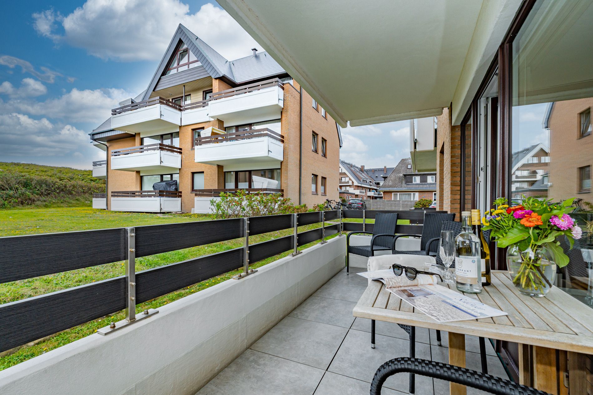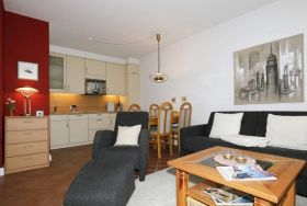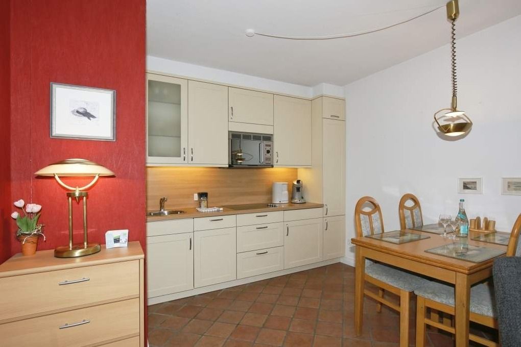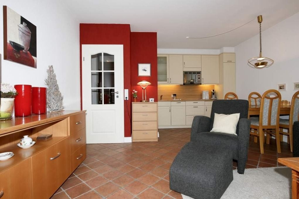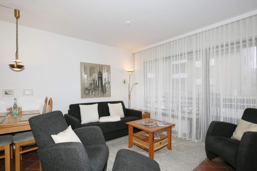 Erwartet Sie diese komplett geflieste 2-Zimmer-Nichtraucher-Ferienwohnung im Parterre zur Westseite. Mit ca. 45 m² Wohnfläche und einem Westbalkon, der in der Nachmittagssonne mit komfortablen Balkonmöbeln und Auflagen zum Entspannen einlädt, bietet die Wohnung Platz für maximal 4 Personen.
