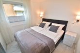 Im Schlafzimmer finden Sie ein hochwertiges, zweiteiliges Boxspringbett (Liegefläche 160 x 200 cm) mit edlem Lederbezug sowie einen Schwebetürenspiegelschrank mit integriertem Safe – für eine besonders kuschelige Atmosphäre und hervorragenden Schlafkomfort. Der stilvoll eingerichtete Wohnbereich überzeugt mit einer smarten Anrichte, einer hochwertigen Schlafcouch (Liegefläche 140 x 200 cm, Schlafhöhe ca. 25 cm) in Leder, passenden Sesseln sowie einem ausziehbaren Esstisch mit bequemen Stühlen. Ergänzt wird das Ambiente durch einen Fernseher, der Ihnen einen herrlichen Blick auf die Sylt-Rosen-Hecke bietet, sowie durch kostenlose Telefonie ins deutsche Festnetz.
