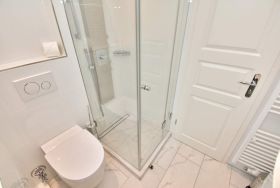 Das elegante Badezimmer besticht mit einer raffinierten Duschpaneele in einer eigenen, transparenten Duschkabine mit extraflachem Einstieg sowie einer modernen Geberit-Toilette. Ein Fön und ein Handtuchtrockner ergänzen den praktischen Waschtisch mit Unterbau und Spiegelschrank.