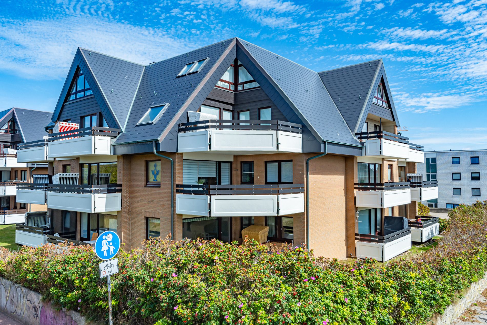 Der großzügige Balkon zur Meer- und Westseite, ausgestattet mit einem behaglichen Strandkorb auf Rollen, lädt in der Nachmittagssonne zum Entspannen ein.