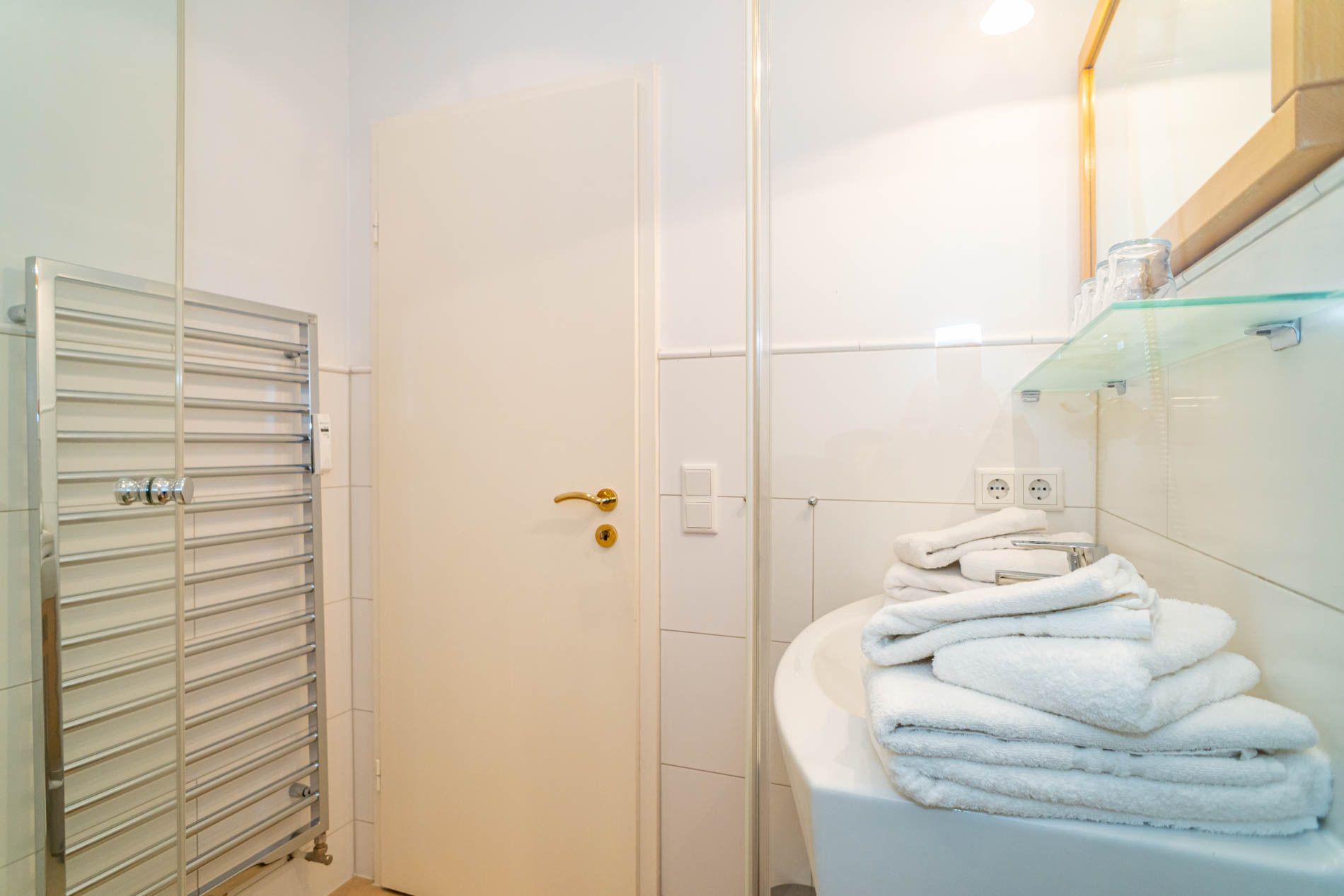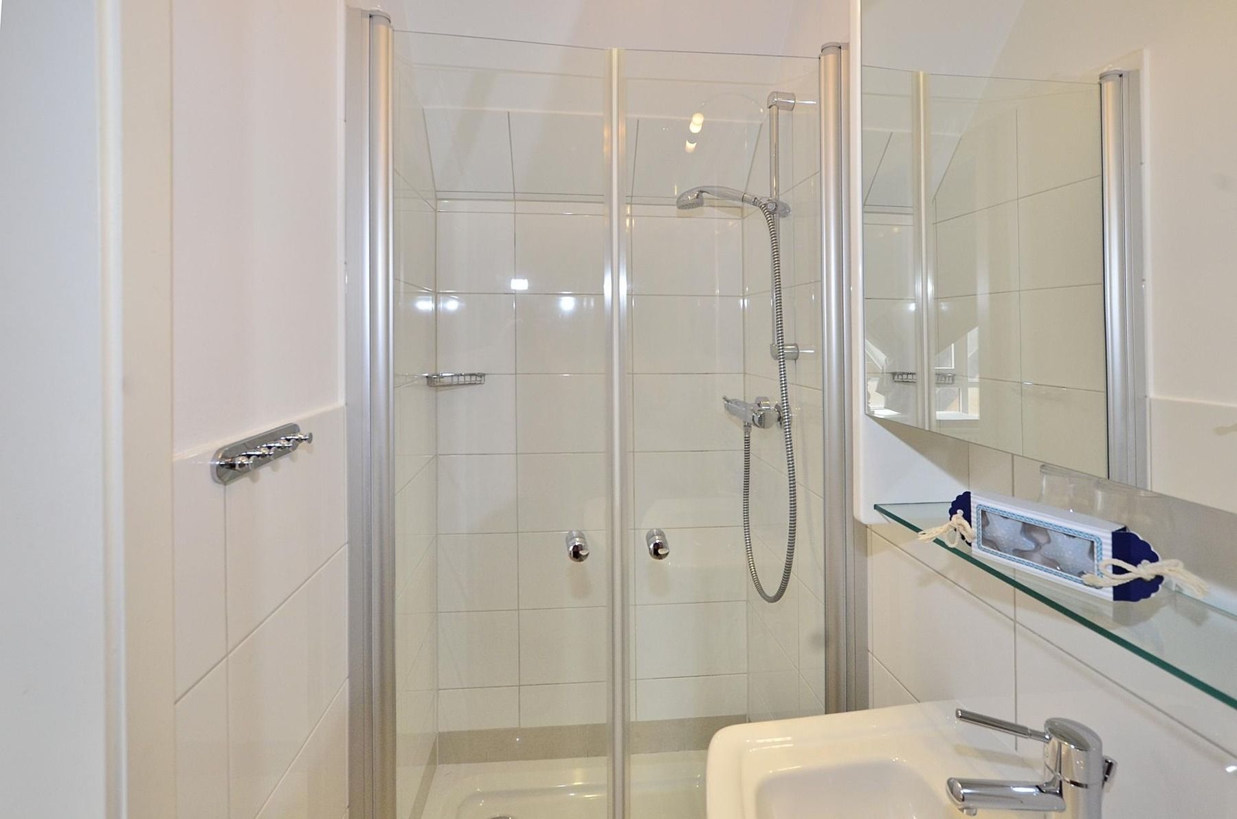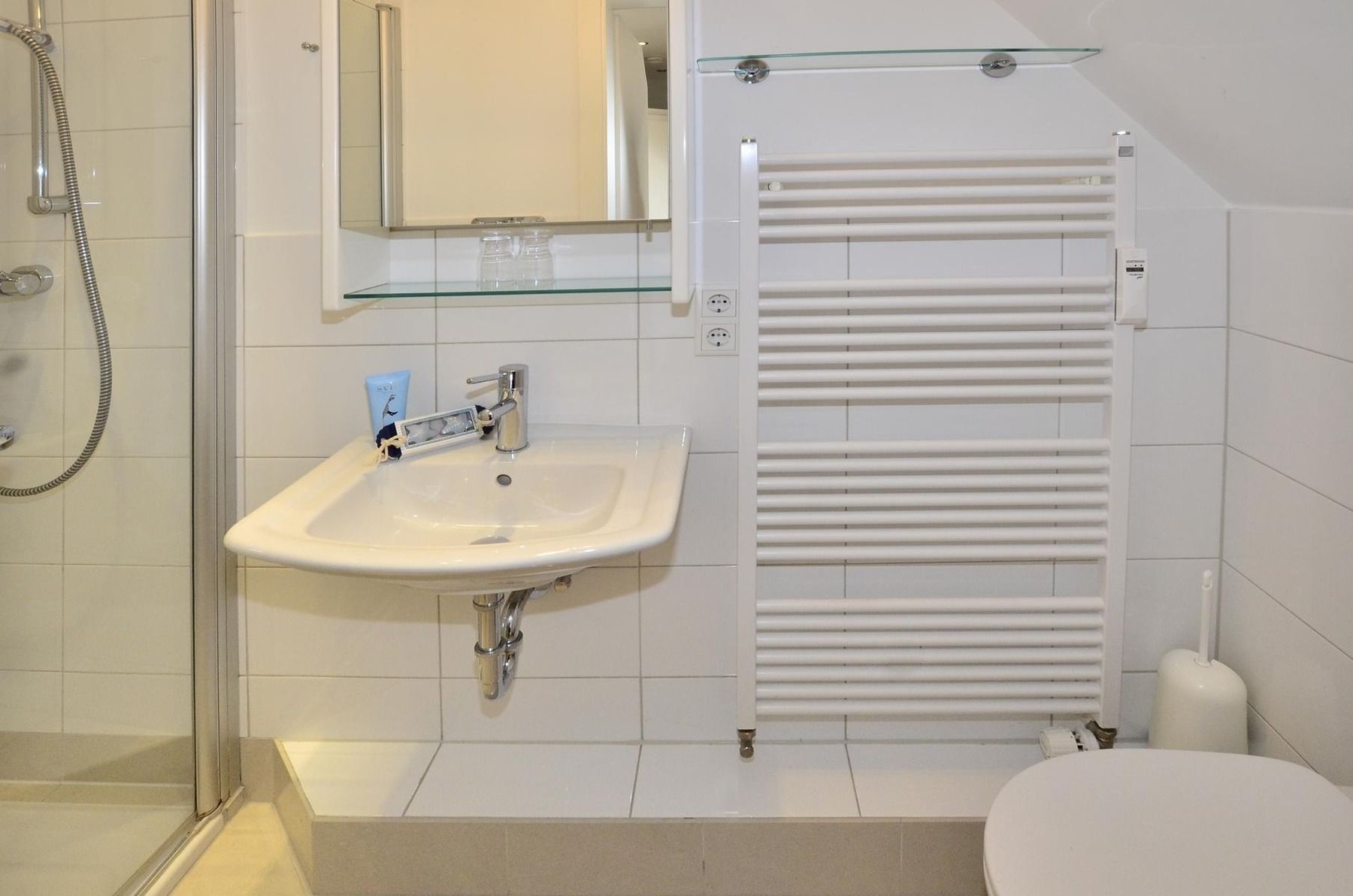 Dachgeschoss:Im Dachgeschoss befindet sich ein praktischer Abstellraum, der Platz für Koffer, Wäscheständer und weiteres Gepäck bietet. Zusätzlich steht hier ein zweites Badezimmer mit Dusche, Waschtisch, Handtuchtrockner und WC zur Verfügung.
