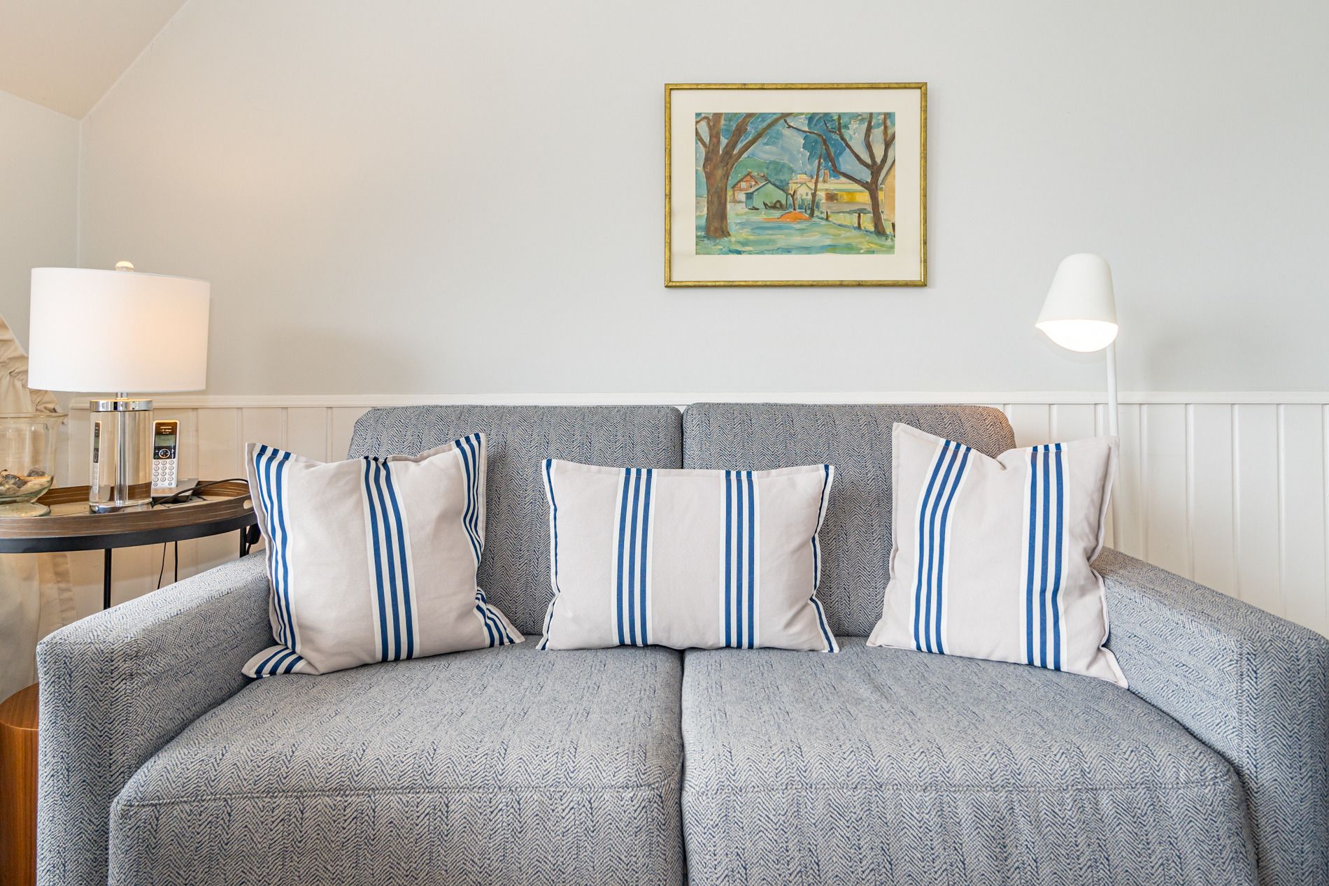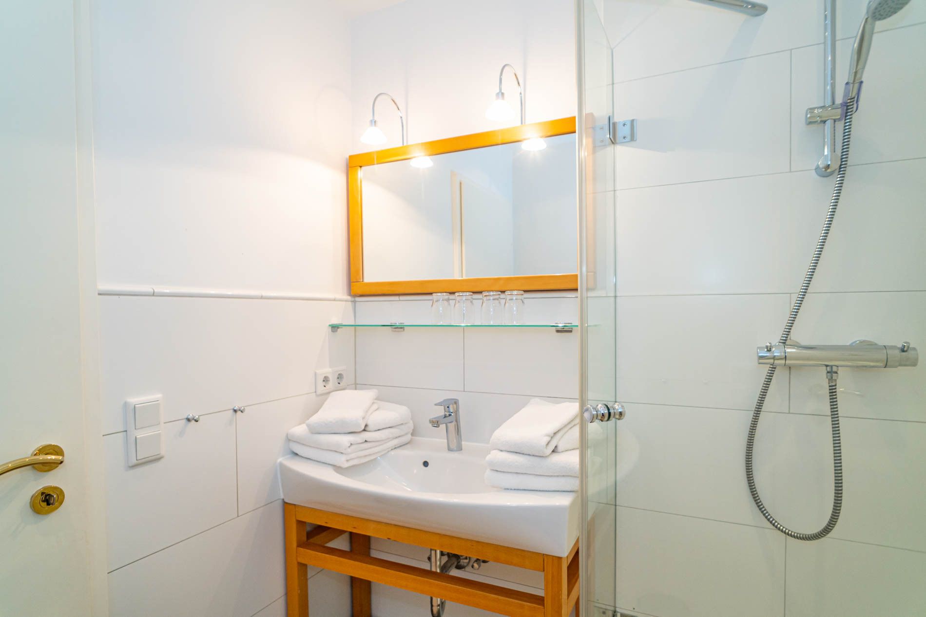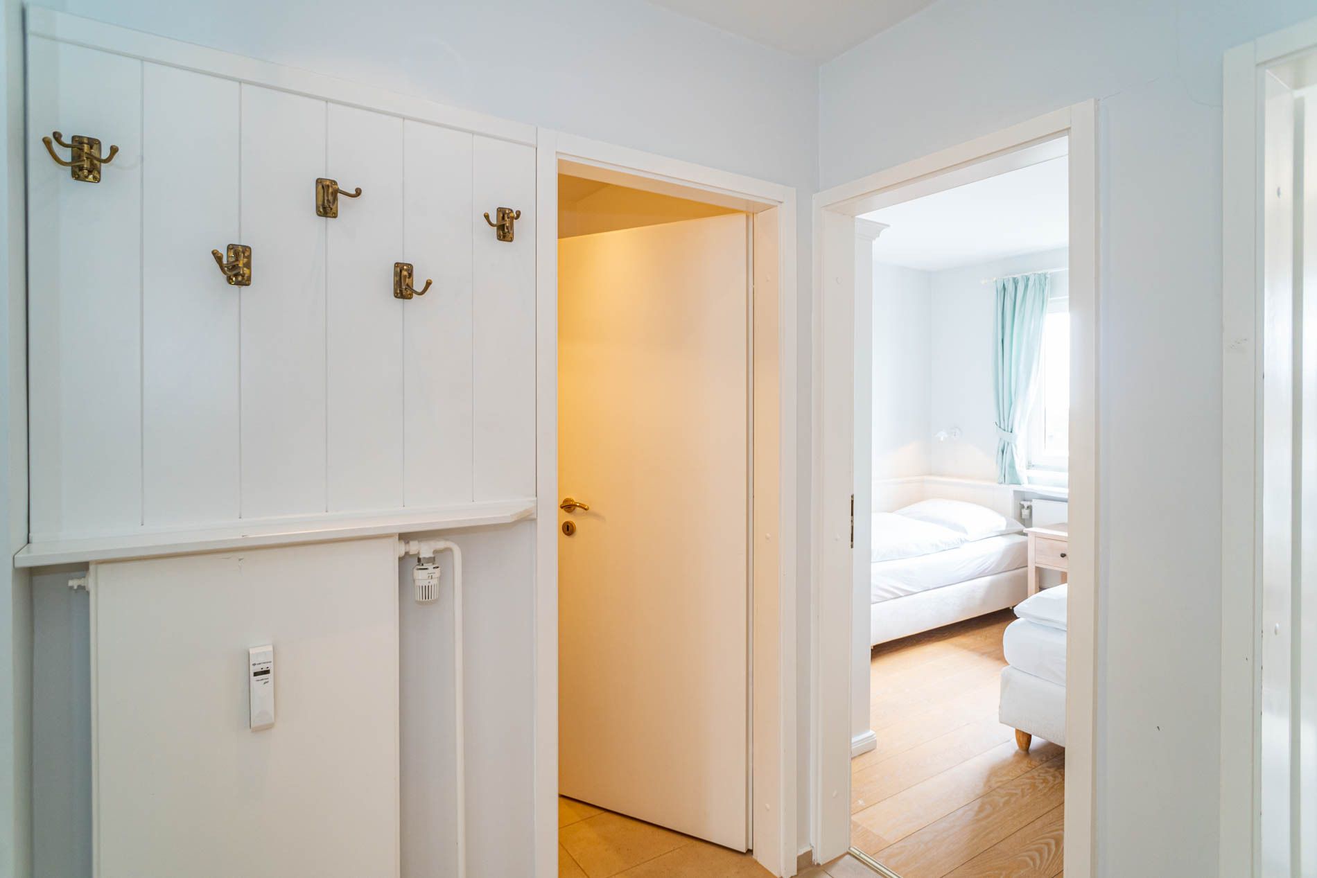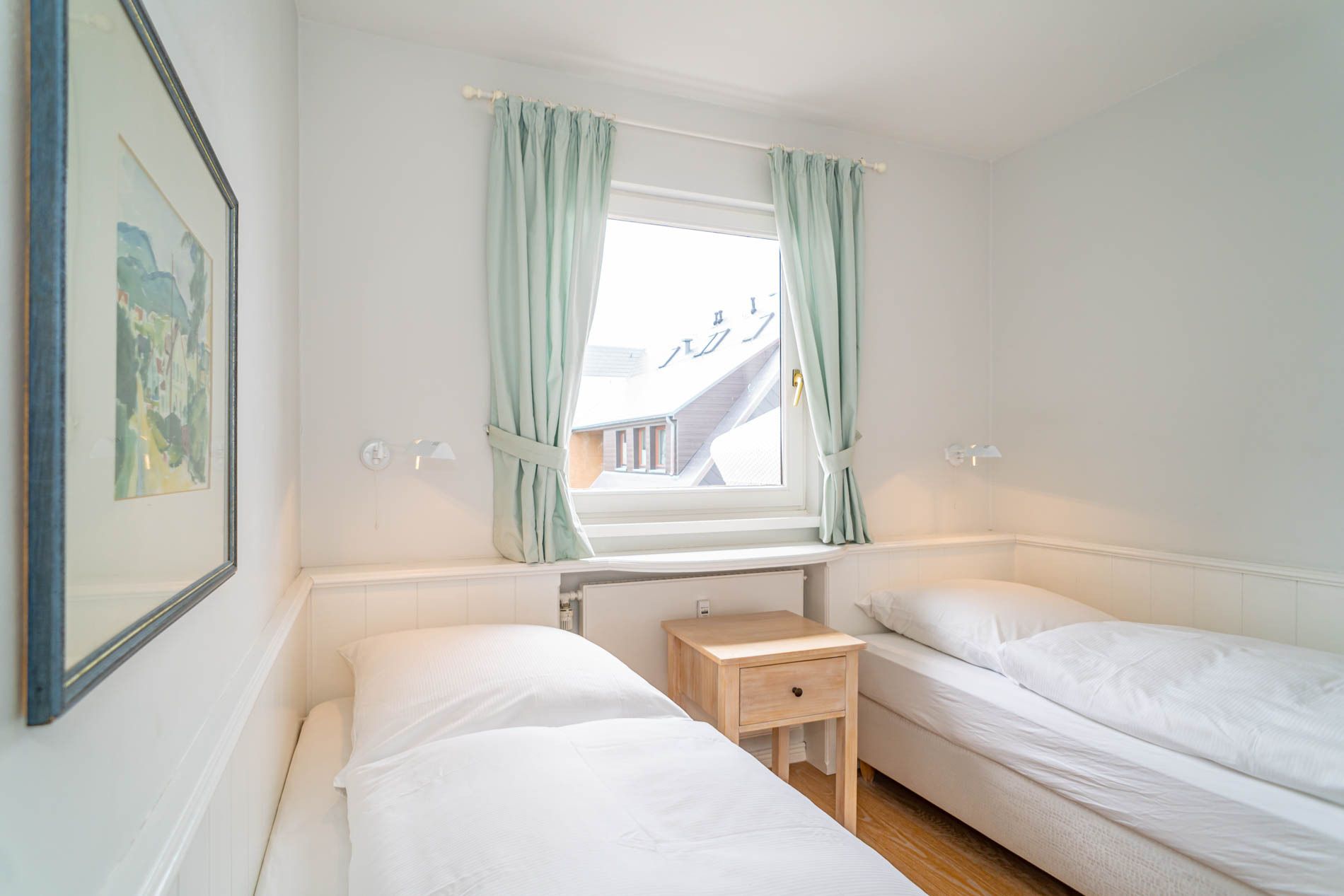 Im separaten Schlafzimmer mit hellem Eichenholzboden stehen zwei bequeme Einzelbetten (jeweils 0,90 x 2,00 m), die für erholsamen Schlaf sorgen. Das moderne Badezimmer ist mit einer Dusche, einem Waschtisch, einem Handtuchtrockner und einem WC ausgestattet.
