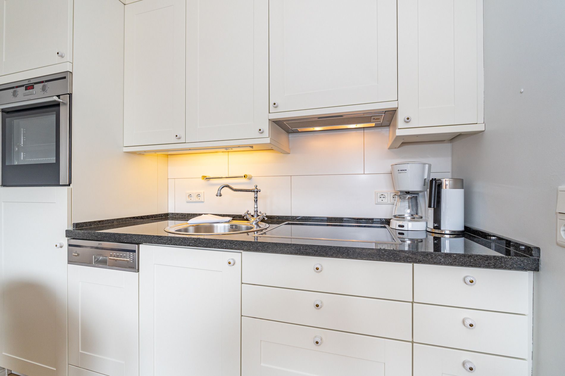 Untere Ebene:Vom Vorflur mit Garderobe gelangen Sie in das geflieste Wohnzimmer mit offener Küchenzeile, das separate Schlafzimmer sowie in das moderne Duschbad/WC. Das geschmackvoll eingerichtete Wohnzimmer verfügt über ein komfortables 2-Sitzer-Sofa (mit Schlafgelegenheit für eine Person, klappbare Lehnen), zwei Sessel, einen separaten Essplatz sowie einen Flachbild-TV, ein CD-Radio, WLAN (ohne Gewähr) und eine Telefonflatrate für kostenfreie Telefonate ins deutsche Festnetz. Vom Wohnbereich haben Sie direkten Zugang zum großzügigen Sonnenbalkon mit herrlichem Ausblick. Die offene Küchenzeile ist mit einem Geschirrspüler, einem Ceranfeld mit 4 Kochfeldern sowie einem Kühlschrank mit 3-Sterne-Gefrierfach ausgestattet. Kaffeemaschine, Wasserkocher und Toaster gehören zur Grundausstattung.