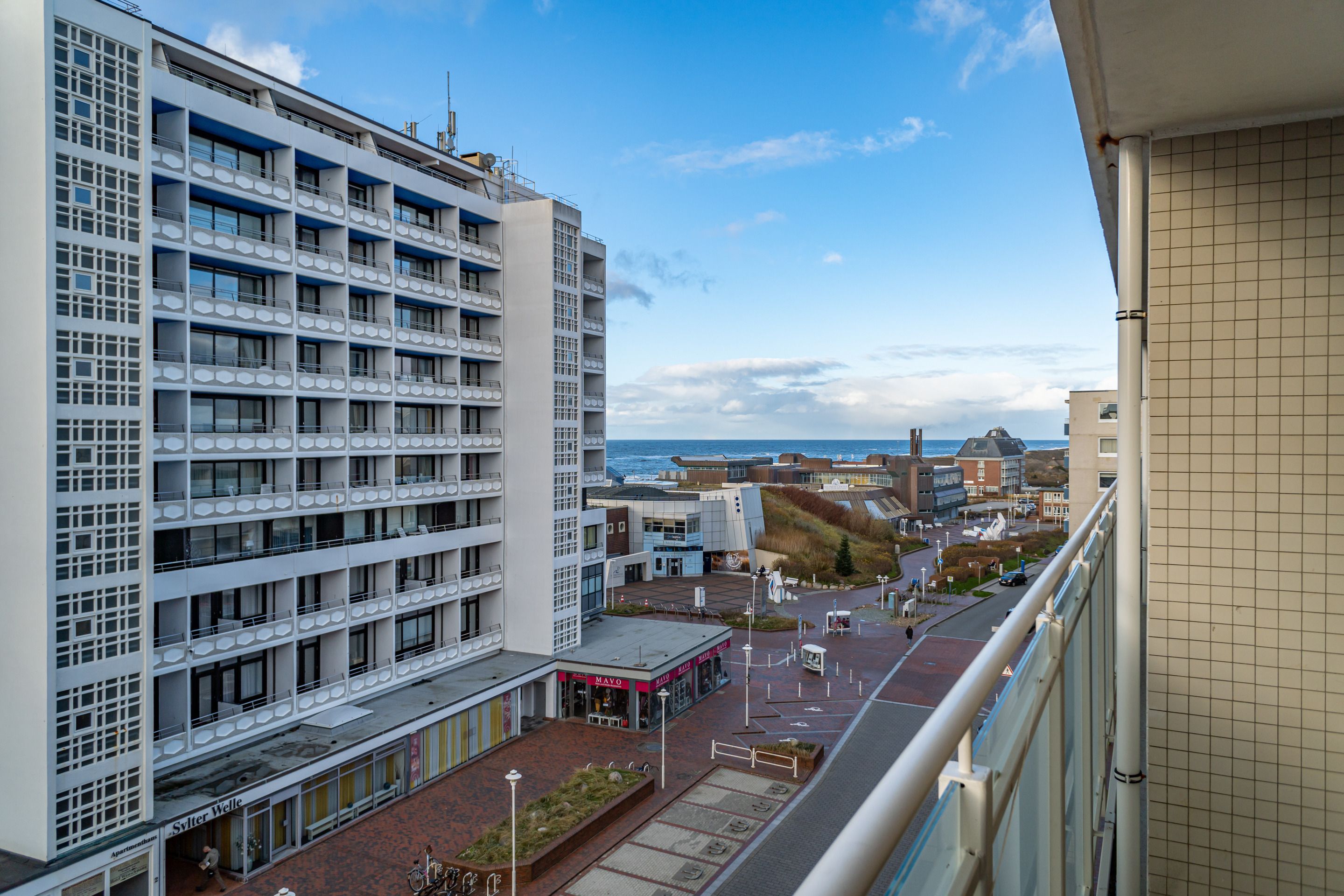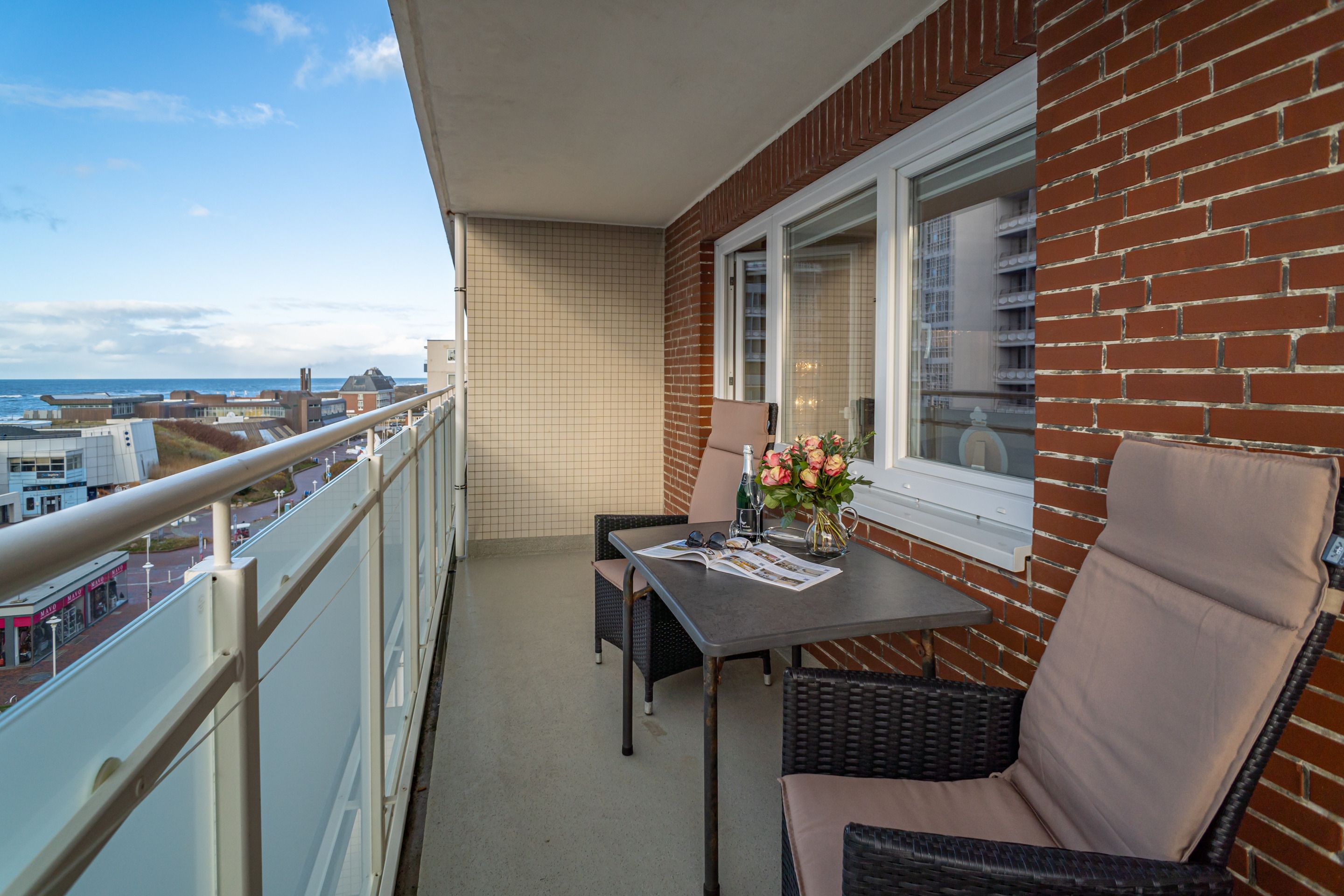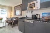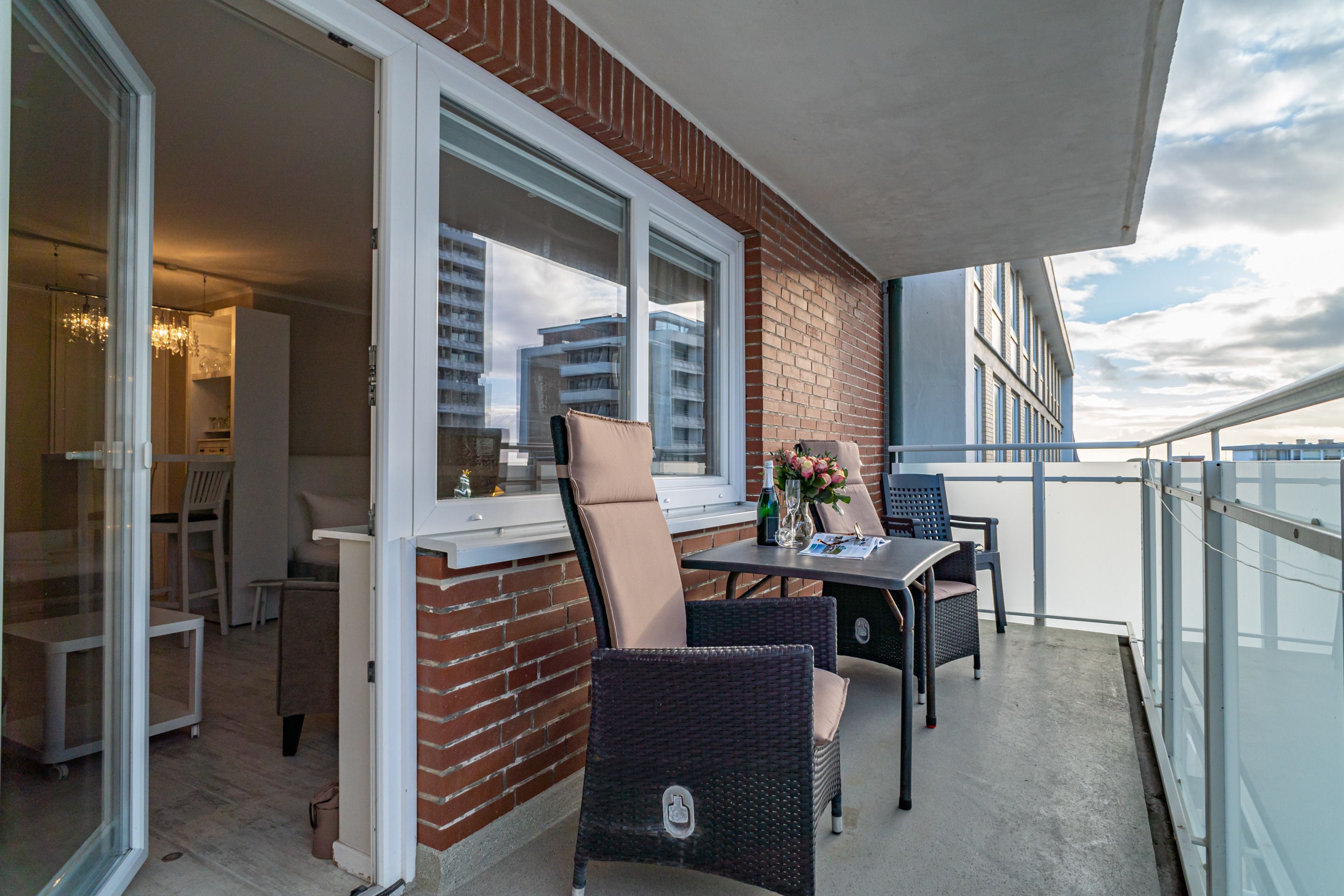 1-Zimmer-Nichtraucher-Ferienwohnung (ca. 32 qm) in der 5. Etage mit Westbalkon (Nachmittagssonne mit Balkonmöbeln) mit kleinem Meerblick, mitten drin und trotzdem ruhig.