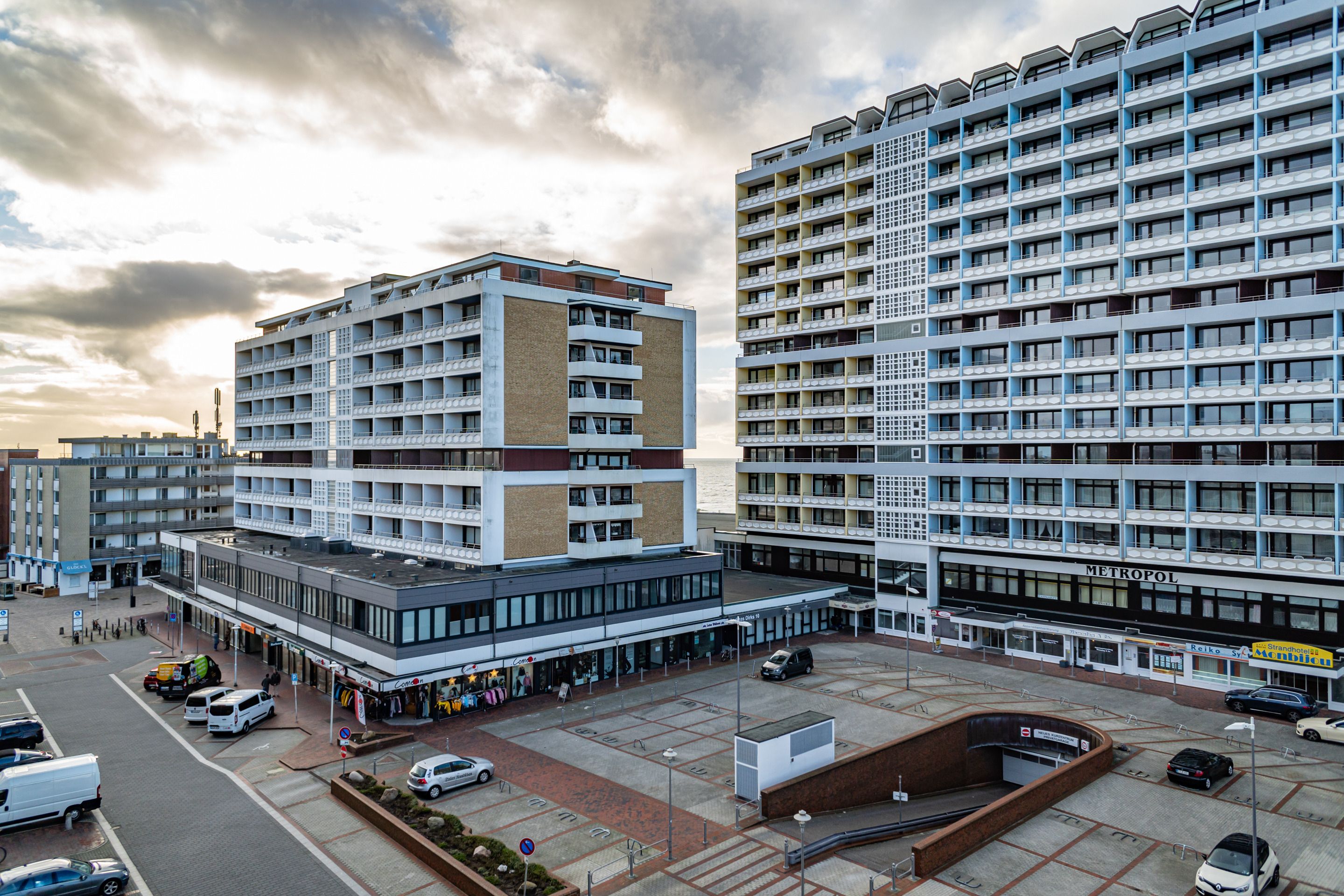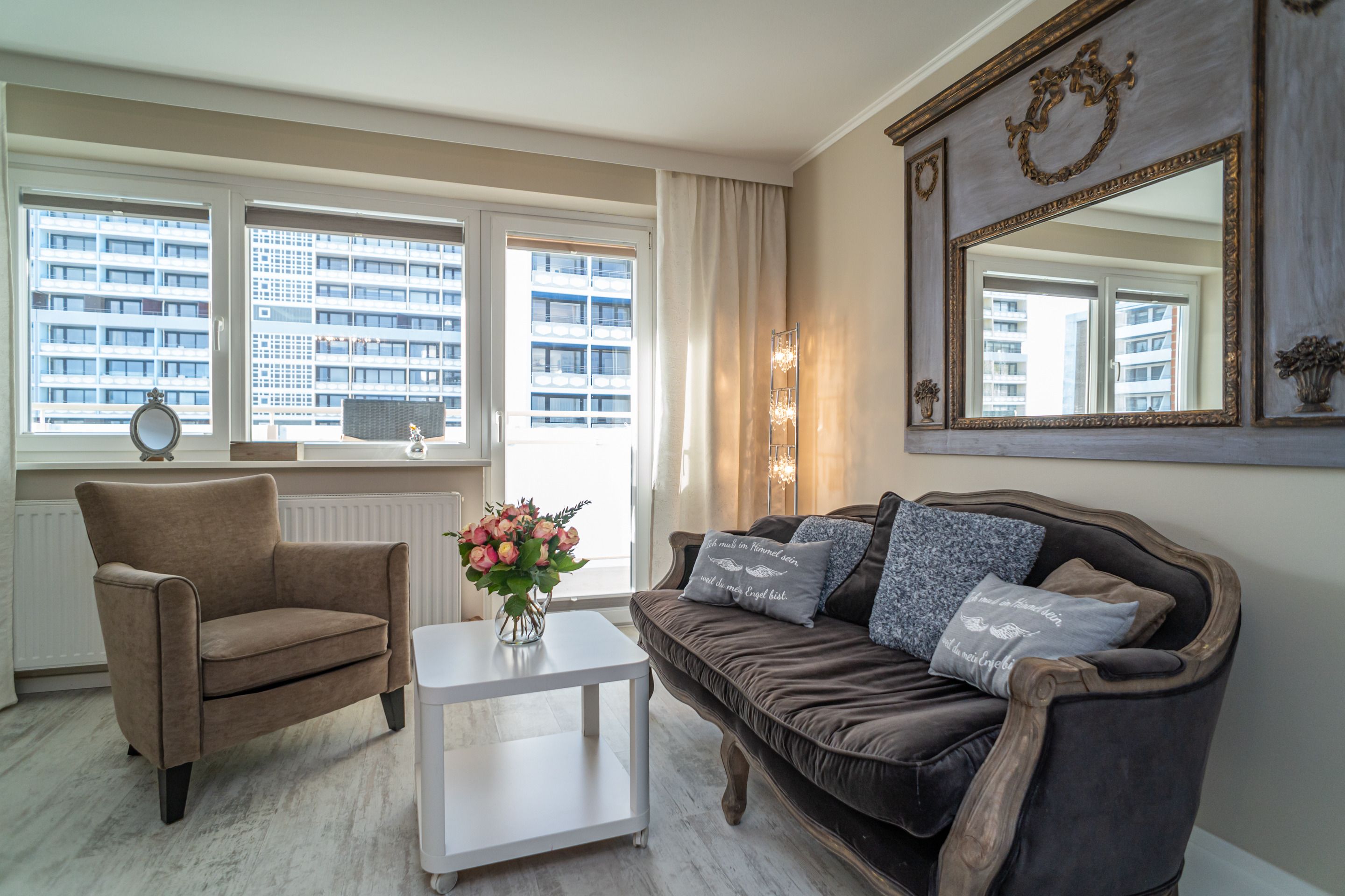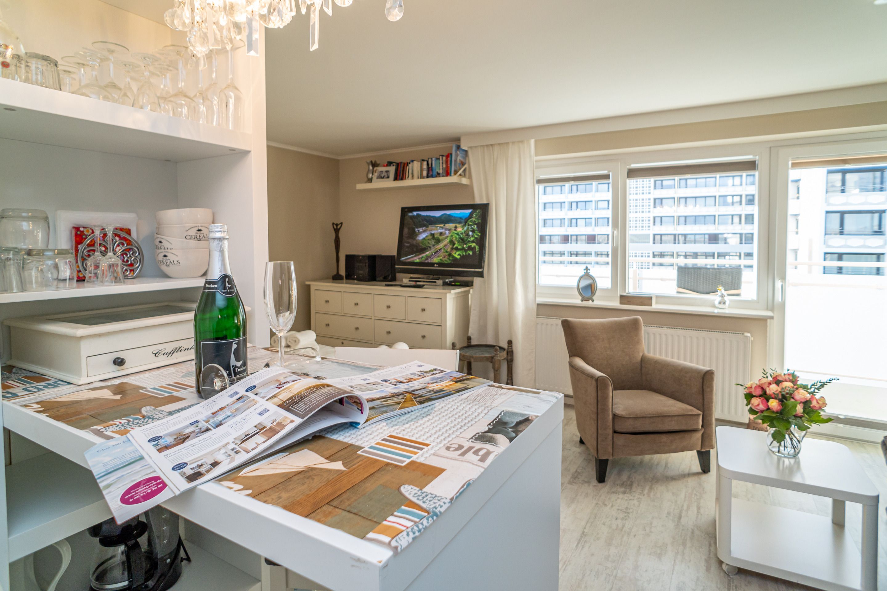1-Zimmer-Nichtraucher-Ferienwohnung (ca. 32 qm) in der 5. Etage mit Westbalkon (Nachmittagssonne mit Balkonmöbeln) mit kleinem Meerblick, mitten drin und trotzdem ruhig.