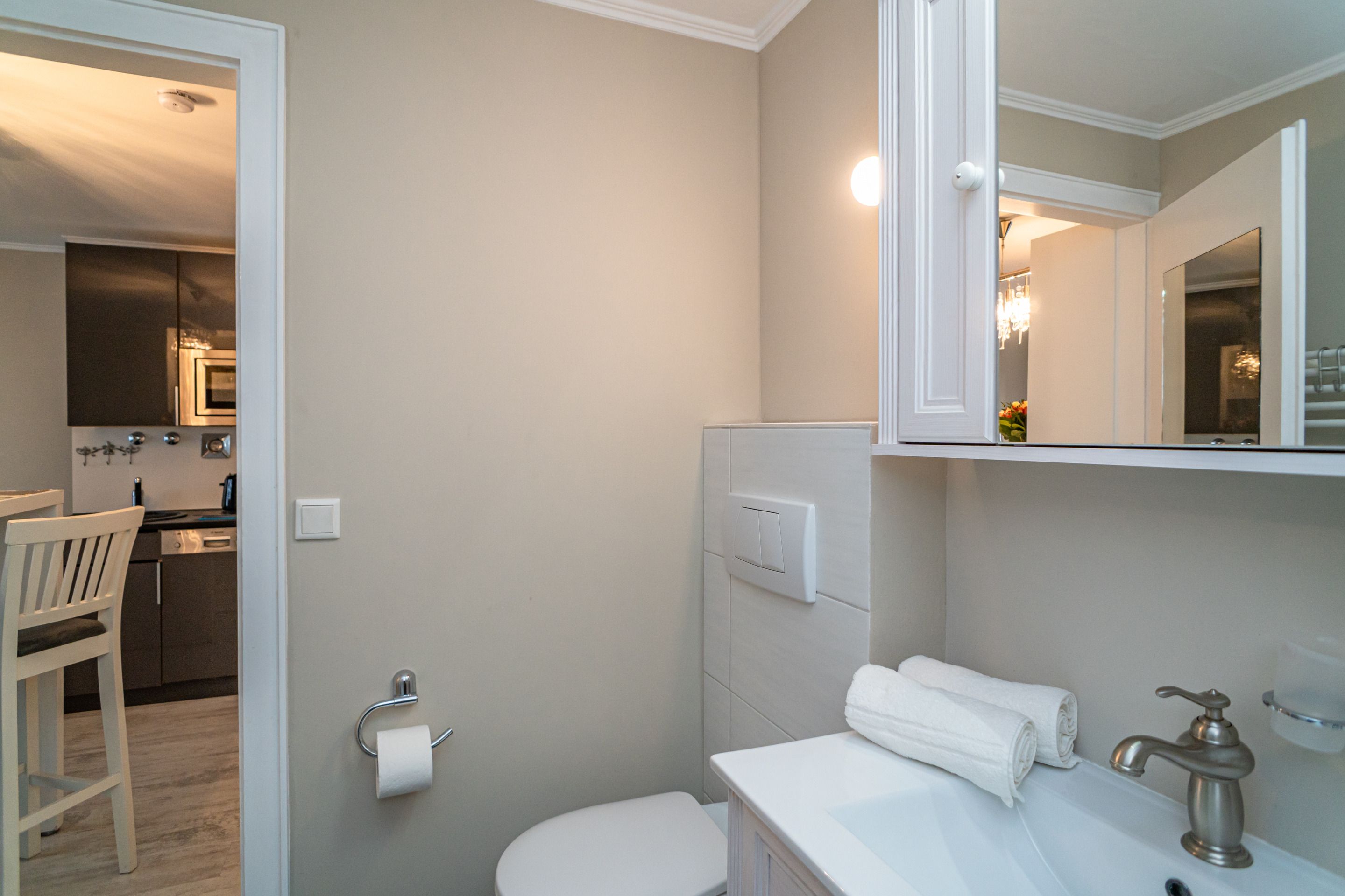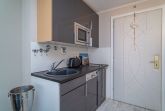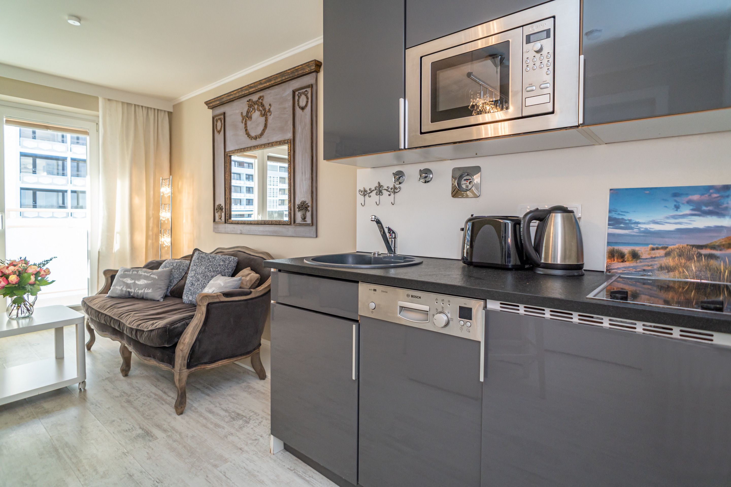 Die Küchenzeile hat einen Geschirrspüler, ein Ceranfeld (2 Kochfelder), eine Mikrowelle und einen Kühlschrank mit 3*-Gefrierfach. Kaffeemaschine, Wasserkocher und Toaster gehören zur Grundausstattung.