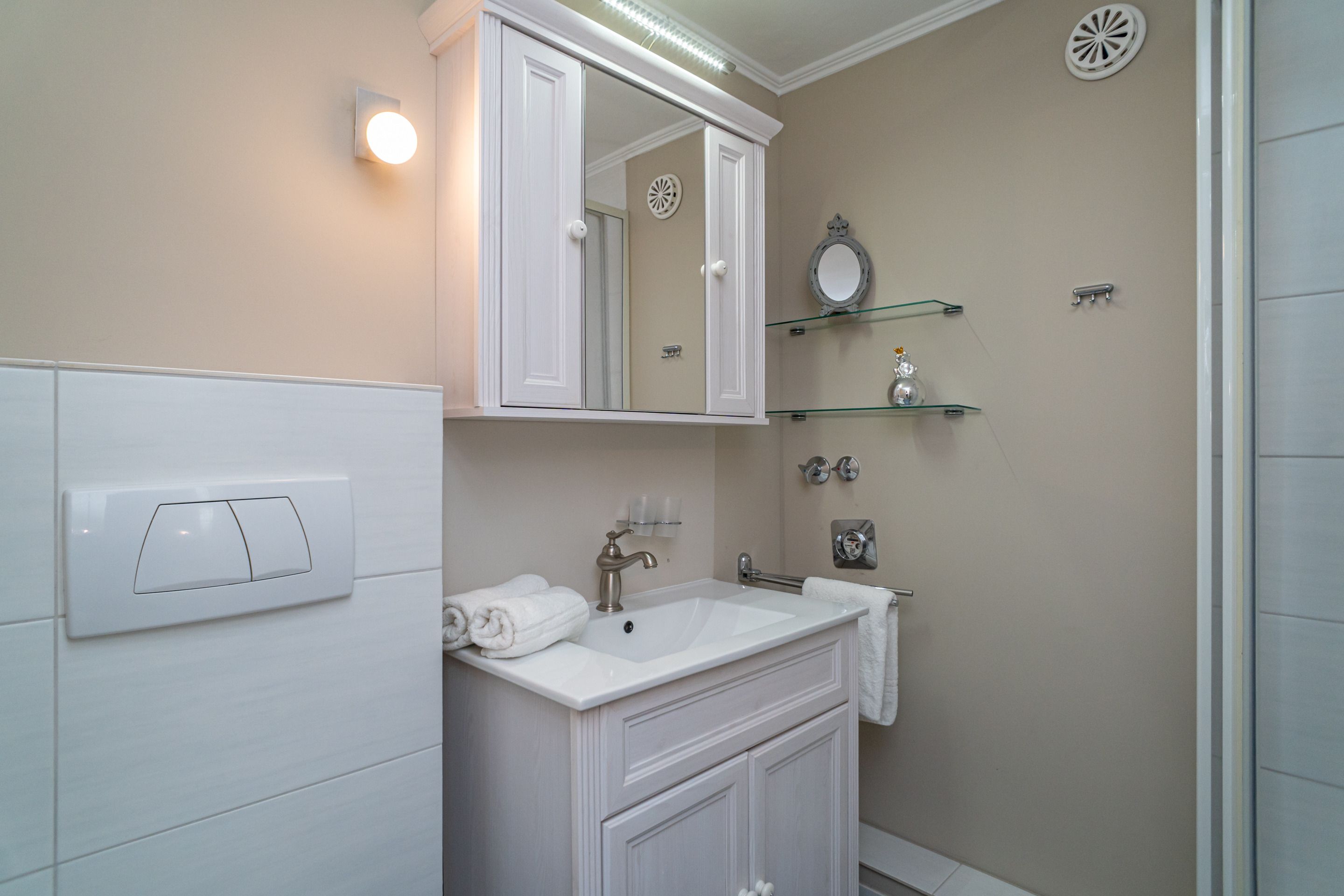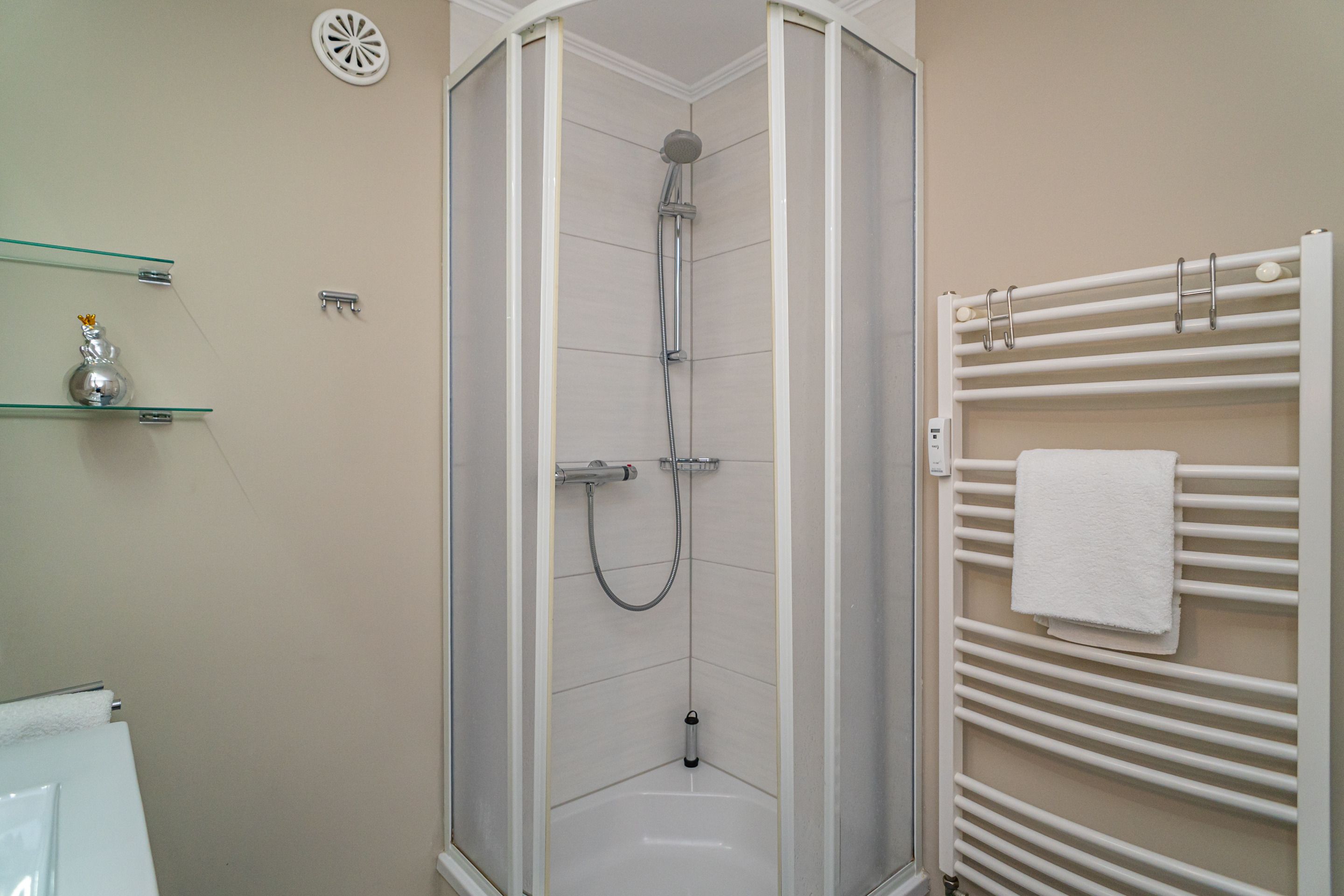 Das Duschbad ist mit Dusche, Waschtisch, Handtuchtrockner, Föhn sowie WC ausgestattet.