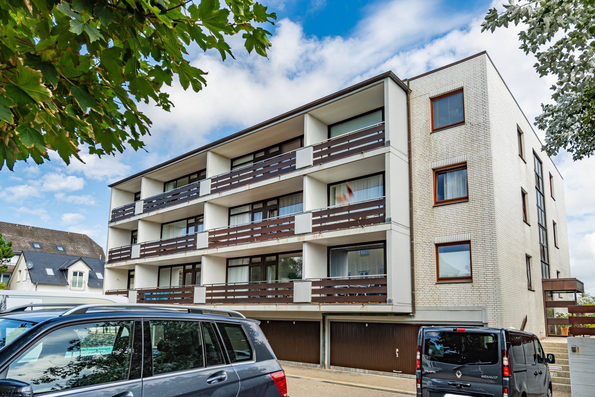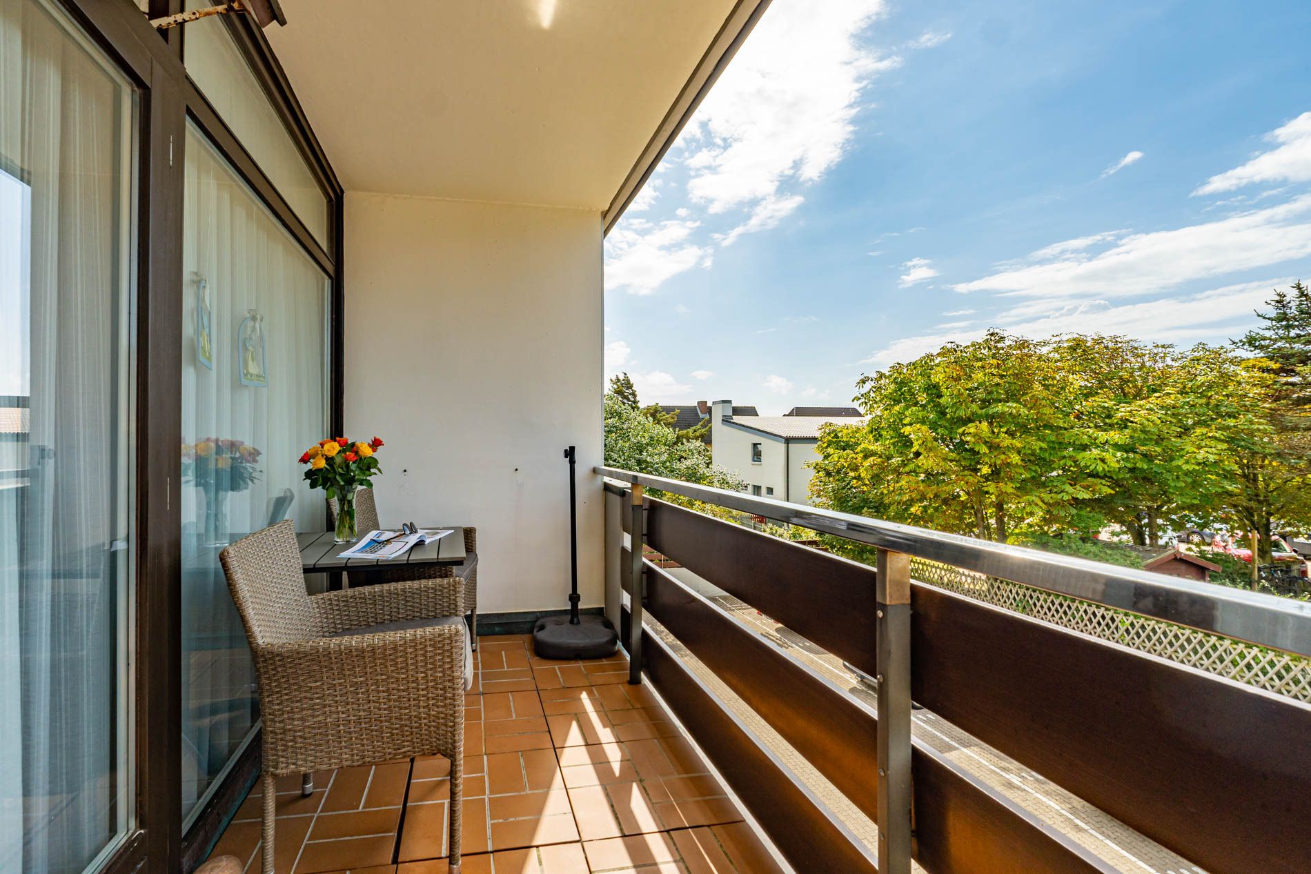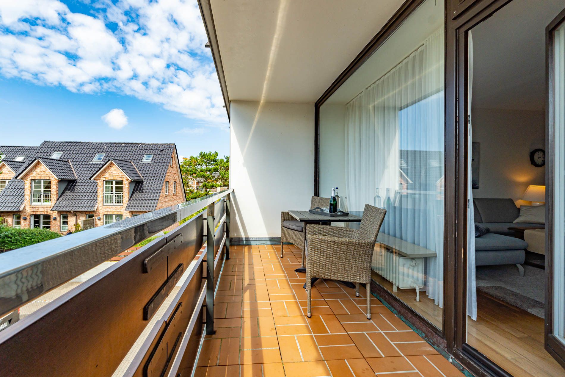 2-Zimmer-Nichtraucher-Ferienwohnung (ca. 50 qm) in der 1. Etage für max. 4 Personen mit Westbalkon (Nachmittagssonne, mit Balkonmöbeln, Auflagen und Sonnenschirm) und eigenem PKW-Außenstellplatz (inklusive).
