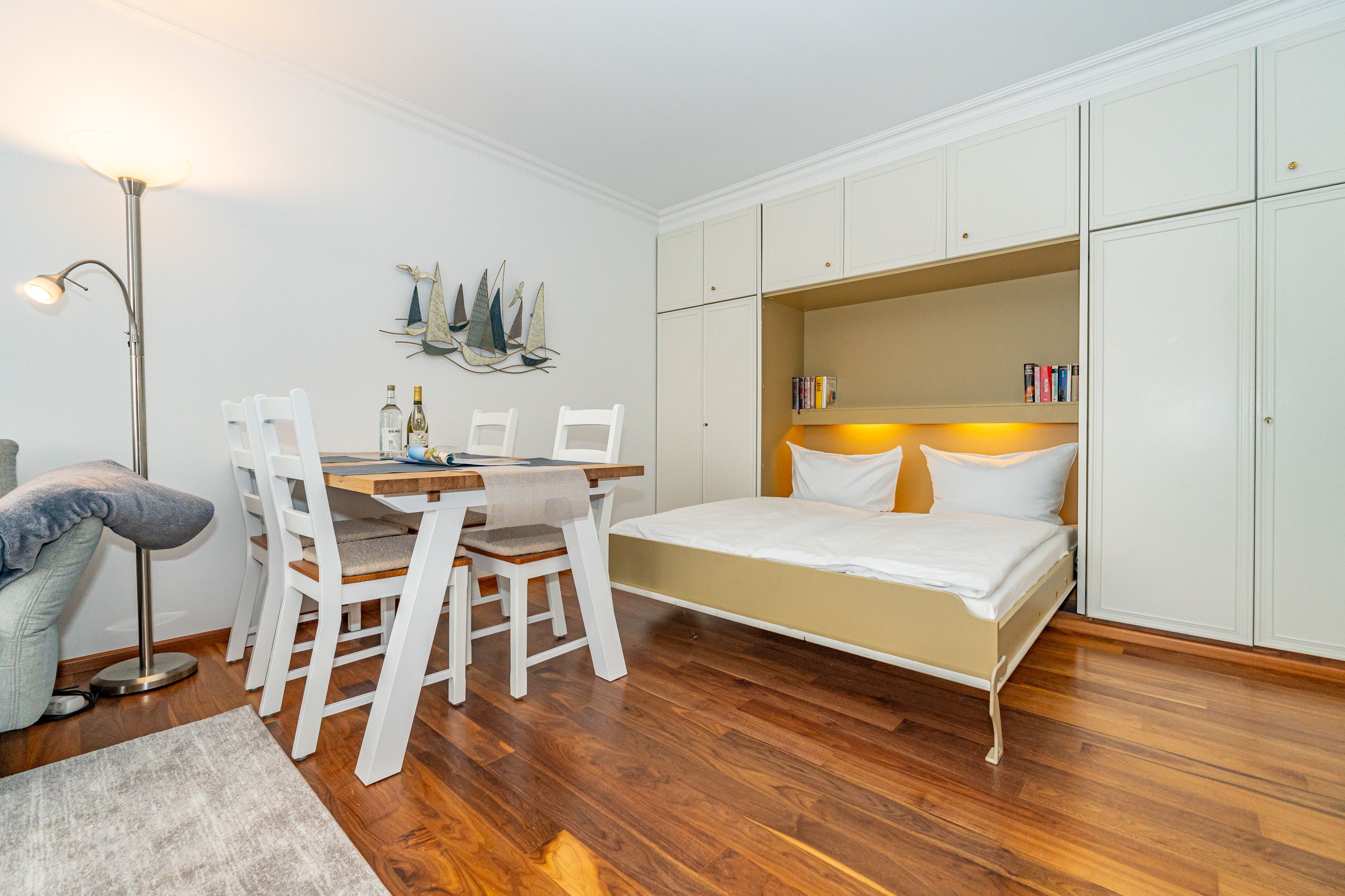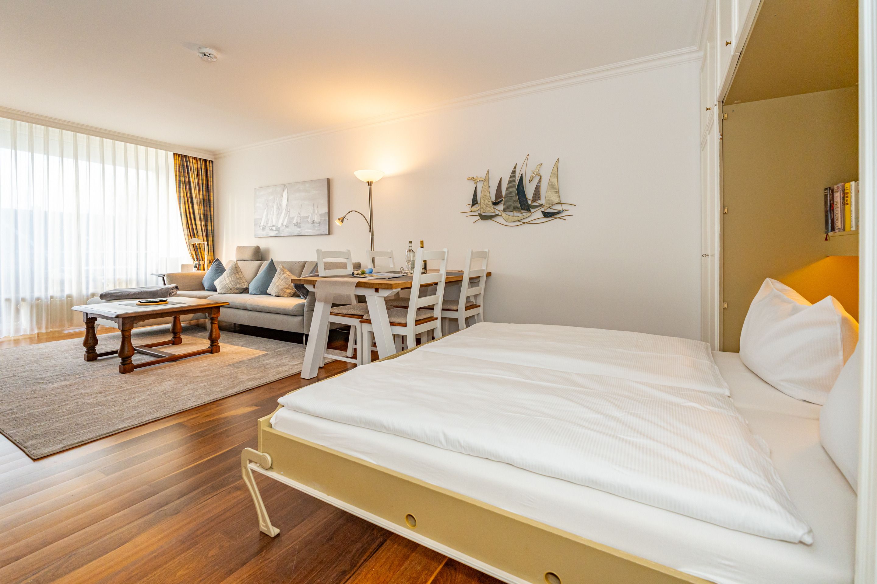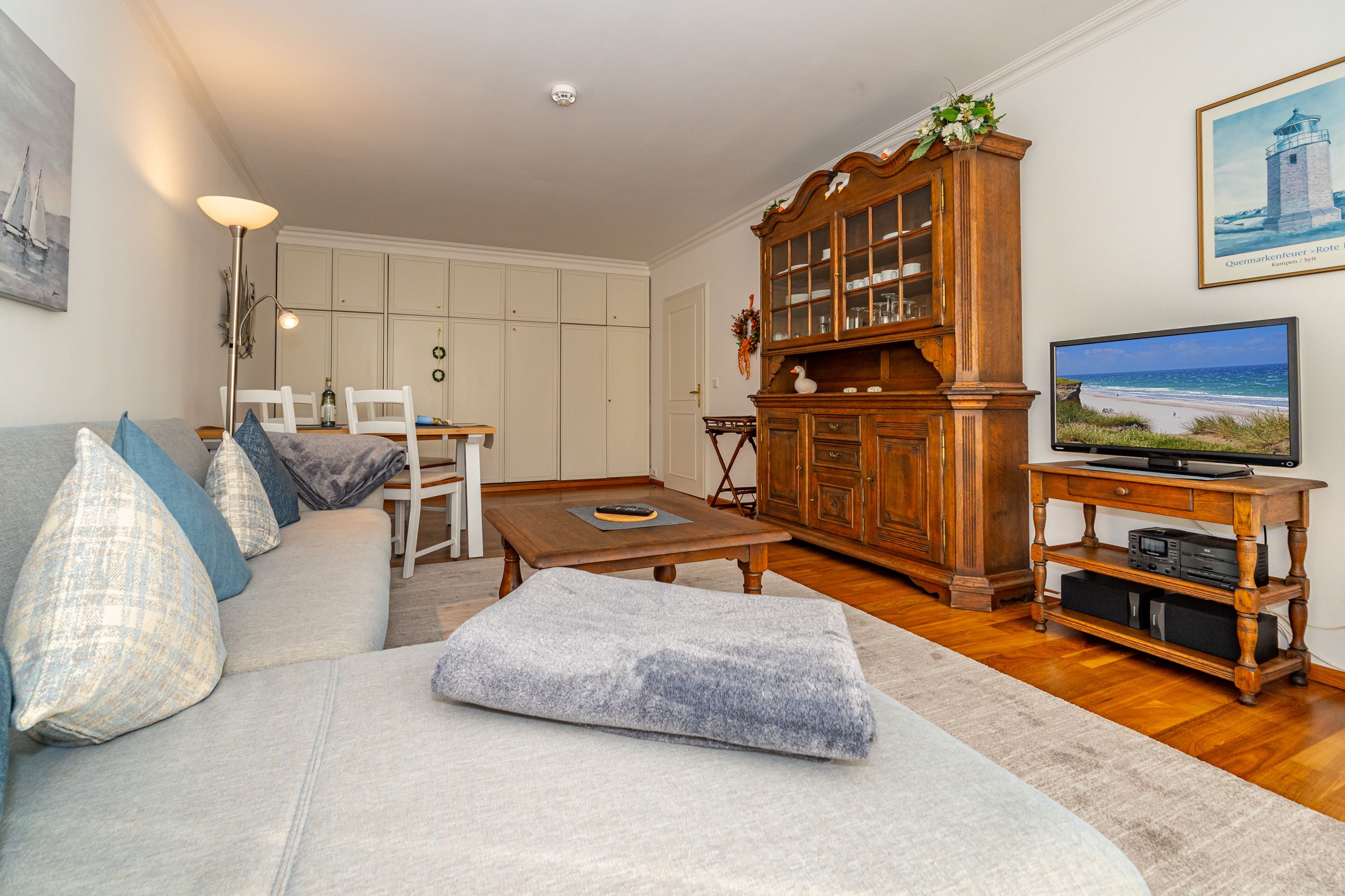 Der Wohnraum besteht aus einer gemütlichen Sitzgarnitur (Sofaecke), einer Essecke, Doppelwandschrankbett (2 Einzelmatratzen), Kabel-Flachbild-TV, HiFi-Anlage, Telefon inklusive Flatrate für Gespräche ins deutsche Festnetz (Handynummern gesperrt) und kostenloser Internetzugang per W-Lan (ohne Gewähr).
