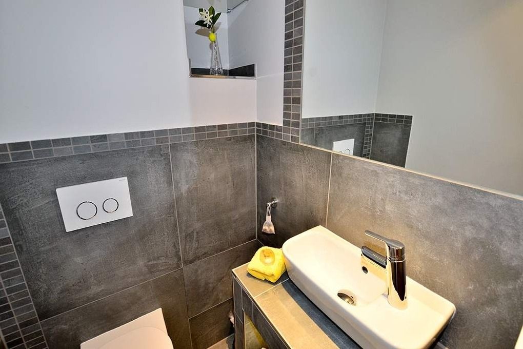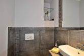 Im Gäste-WC befinden sich ein WC, ein Waschtisch und ein Handtuchtrockner.