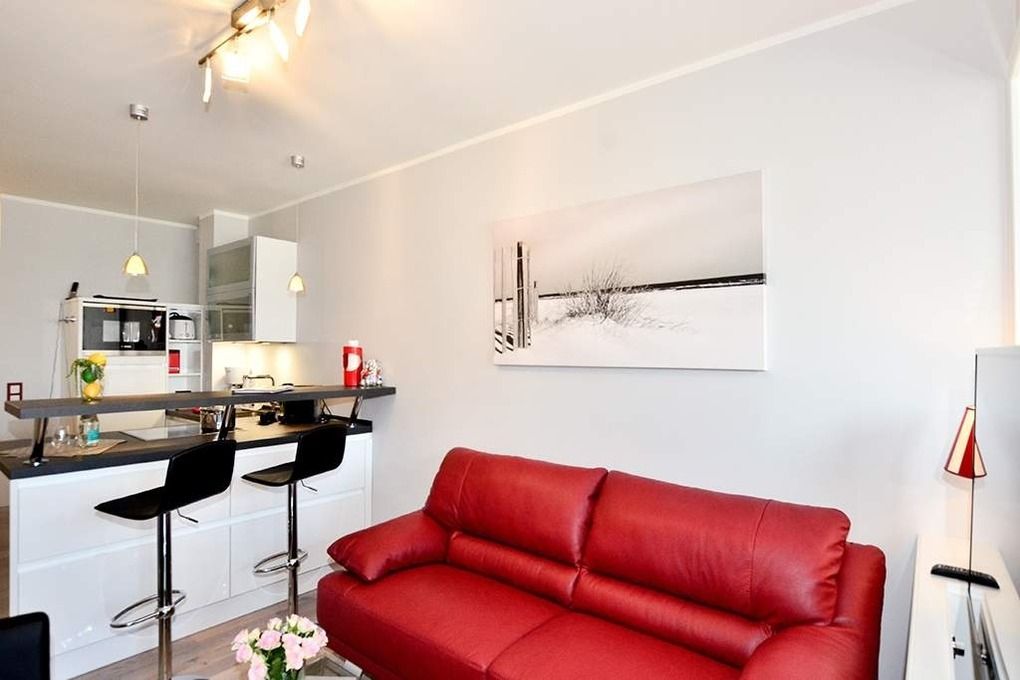 Hochwertig und geschmackvoll renovierte 2,5- Zimmer-Ferienwohnung, Nichtraucher, ca. 60 m², in der 2. Etage zur Ostseite für max. 4 Personen mit Ostloggia (Morgensonne mit Balkonmöbeln und Auflagen).