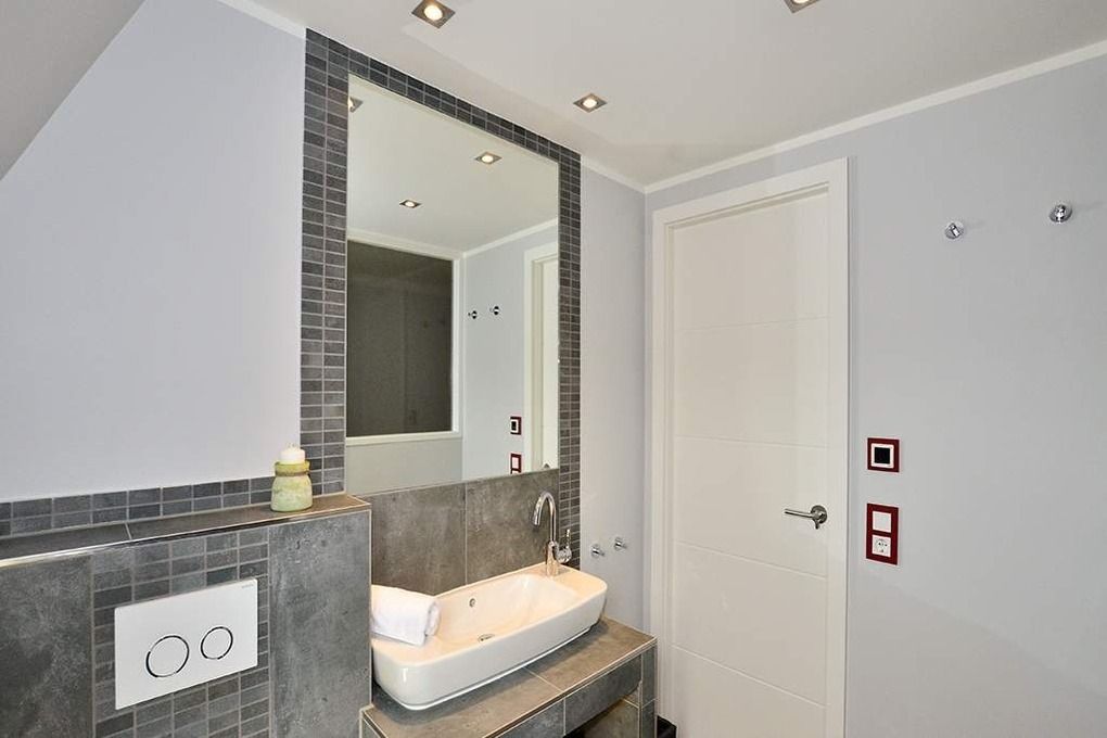 Im neuen Bad befinden sich eine Dusche mit flachem Einstieg, ein Waschtisch, ein WC und ein Handtuchtrockner.