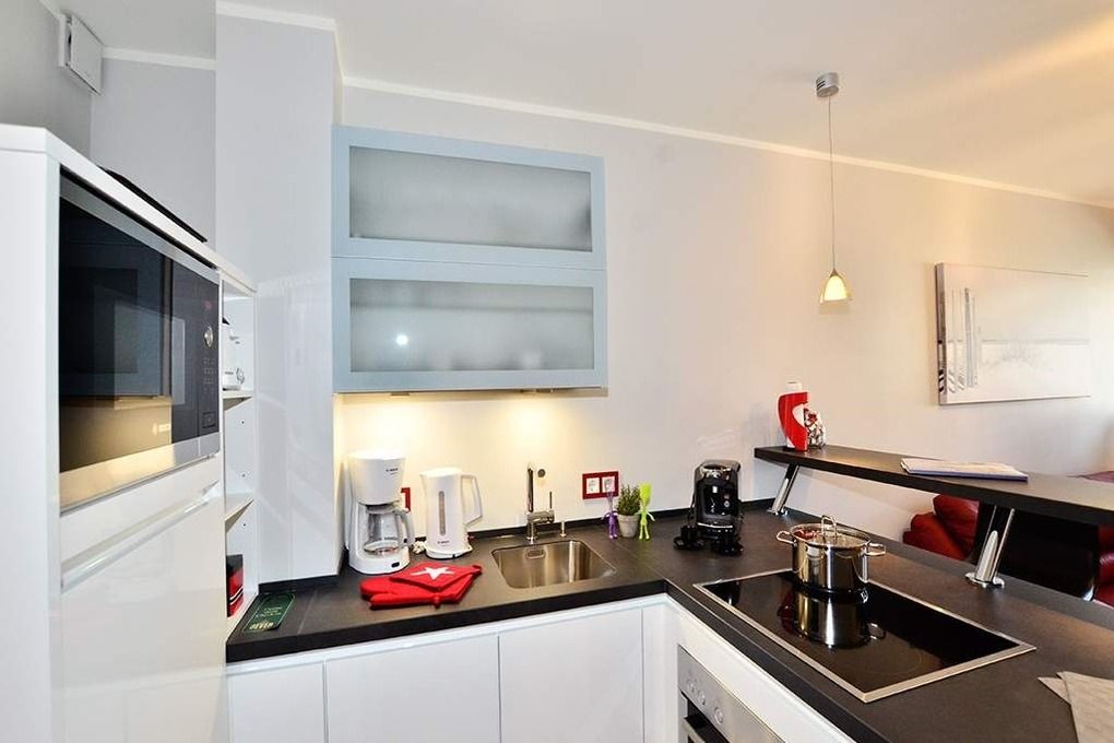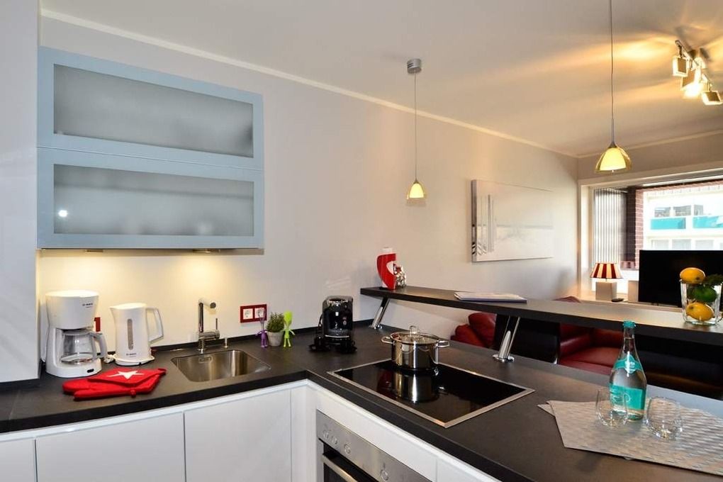 Die neue, moderne Küchenzeile ist ausgestattet mit einem Geschirrspüler, einer Mikrowelle, einem Cerankochfeld, Kühlschrank mit 3-Sterne-Gefrierschrank. Kaffeemaschine, Wasserkocher und Toaster gehören zur Grundausstattung.