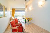 Die offene Küche hat einen Geschirrspüler, ein Ceranfeld mit zwei Kochfeldern und einen Kühlschrank. Kaffeemaschine, Wasserkocher und Toaster gehören zur Grundausstattung,