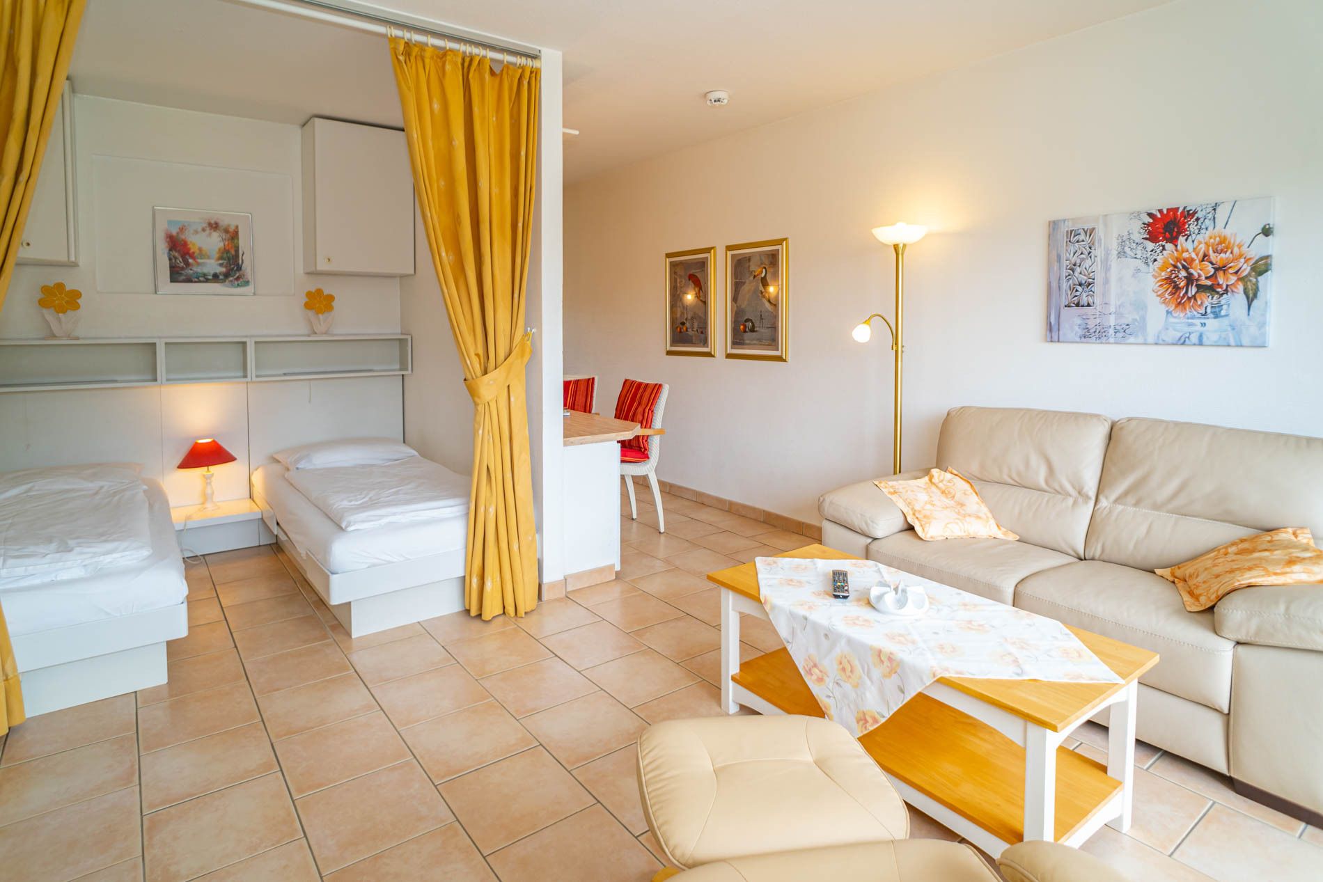 Das Wohnzimmer besteht aus einer Sitzgarnitur (Zweisitzer-Couch, 1 Sessel), einem Essplatz, Kabel-TV, Telefon, W-Lan (ohne Gewähr).