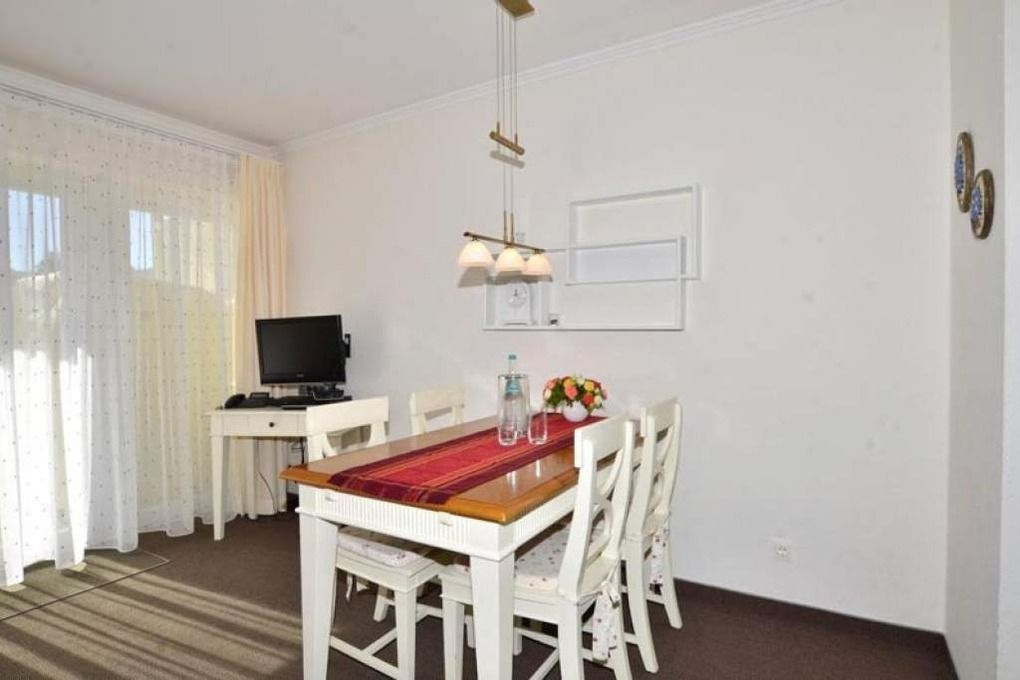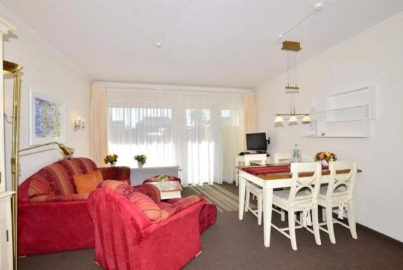 2-Zimmer-Nichtraucher-Ferienwohnung ca. 48 qm im Parterre zur Südseite mit Südterrasse (mit Strandkorb, Balkonmöbeln und Auflagen) für max. 4 Personen.
