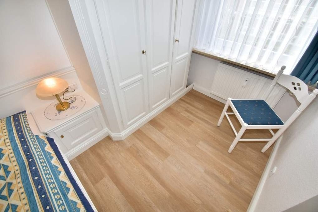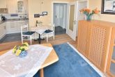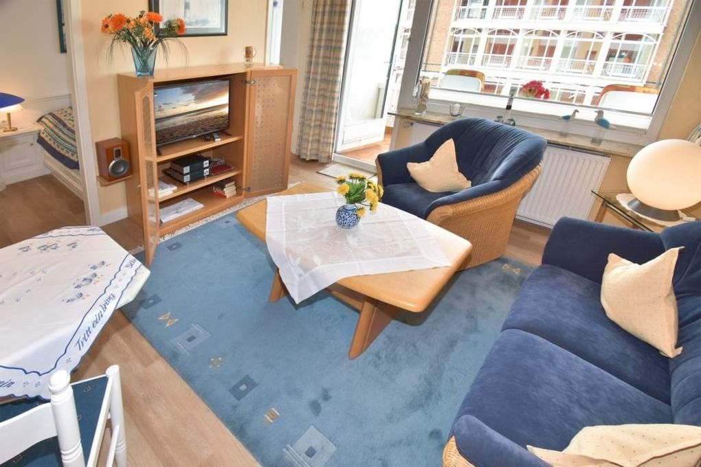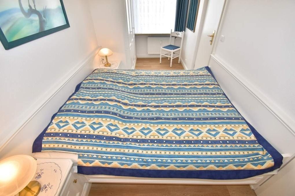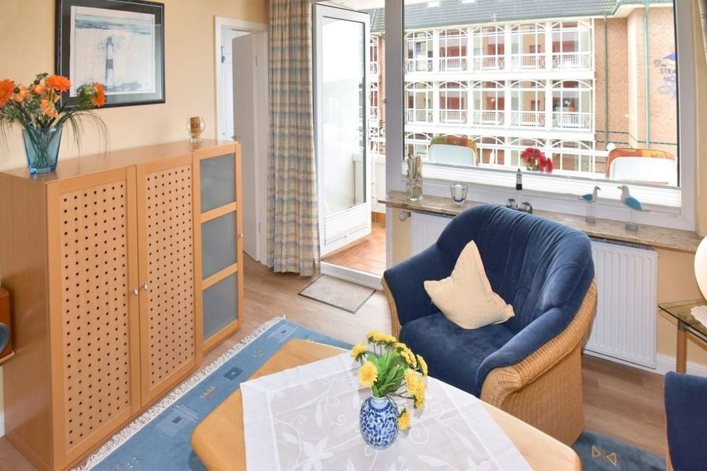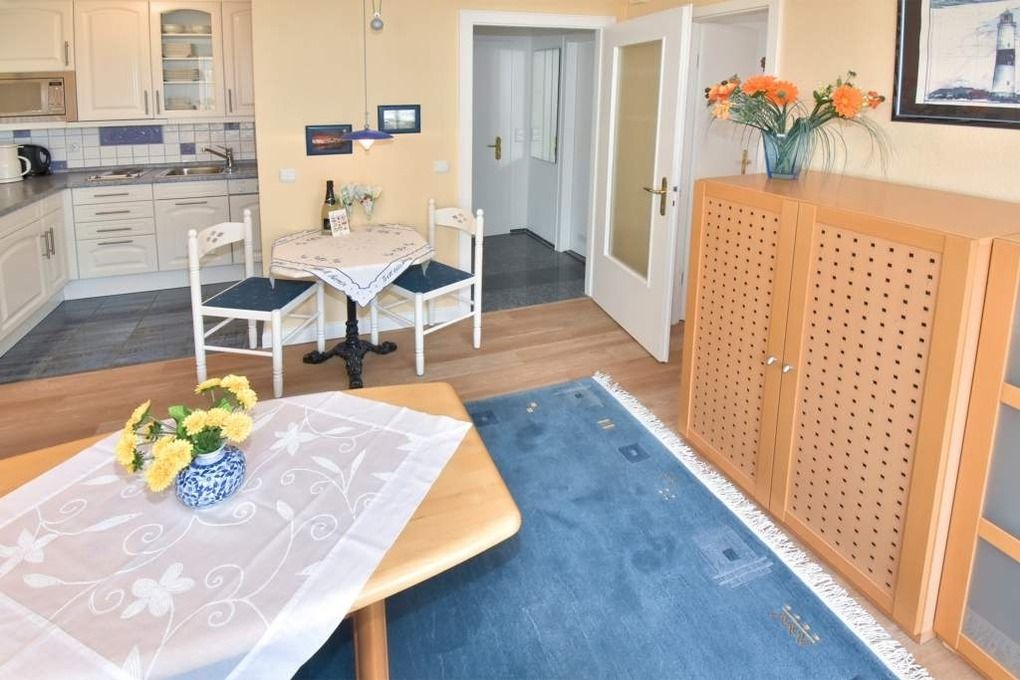 2-Zimmer-Nichtraucher-Ferienwohnung, ca. 38 qm, in der 1. Etage mit Meerblick vom Südbalkon (Nachmittagssonne, mit Balkonmöbeln und Auflagen) für max. 2 Personen.